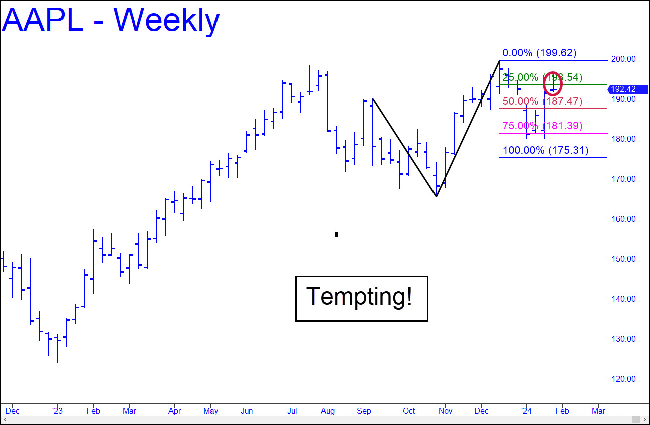 The ‘mechanical’ short I mentioned here last week came home to roost with a pop through the green line (x=193.54) on Monday. OE (Option Experiment) participants already hold a small bearish position in the form of a vertical put spread, but it expires on Friday and won’t come alive unless the stock tanks $10. That’s hardly impossible, but I was reluctant to open a new front ahead of the weekend with an additional position. We should trade with a bearish bias because of the ‘mechanical’ signal, so stay tuned to the chat room and your email notifications if you want to keep apprised. My strong gut feeling is that AAPL is much too hired to hoist itself above the 199.62 point ‘C’ high of the reverse pattern shown without pulling back first, possibly sharply.