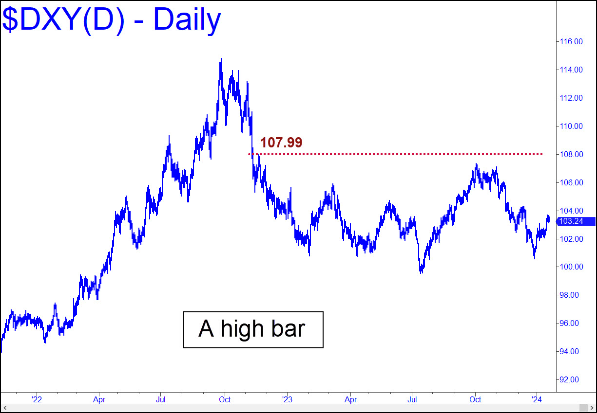 The dollar made yawn-worthy headway last week with a one-day leap for who-knows-what-reason. The single prior peak the move surpassed on the daily chart was an ‘internal’ rather than the ‘external’ we require to signal a true impulse leg. The first such ‘external’ lies at 104.26, and it can serve as our minimum requirement for signaling a move capable of rejuvenating the long-term bull begun in 2011. Even then the rally would be suspect, for it would still fall well shy of theĀ 107.99 ‘external’ high from November 2022 where a bull run crapped out last October. Our skepticism and a high bar are warranted, since the dollar must weather a Treasury auction calendar for 2024 that will require $8.5 trillion of borrowing to finance rollovers and U.S. budget outlays. Please see my current commentary for additional notes on this.