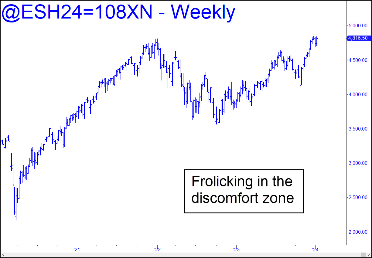 We’ll need to be on our guard as the S&Ps frolic in the discomfort zone, just an inch above the then-record highs recorded at the start of 2022. The Mother of All Tops is very likely to come with a series of upward spasms, each of which creates a marginal new high. However, looking casually at this chart, the eye ‘wants’ to see one of those highs occur on a nasty and distinctive spike that presumably would disembowel the last remaining shorts. This may require a running start from below 4500, and if the futures were to fall to there now, I would still expect one last run-up. Meanwhile, Microsoft seems no less likely to reach the 430 target I’ve been drum-rolling as a bellwether, even if the process is as fraught as the one I’ve described above for the S&Ps.