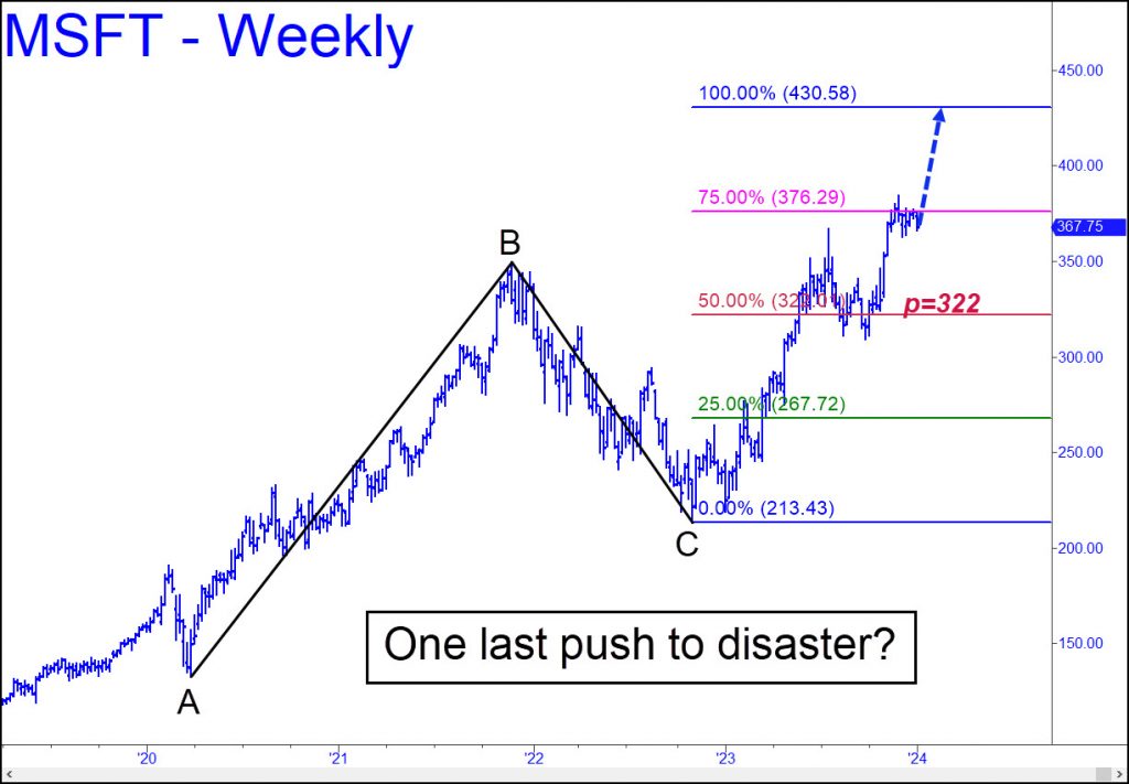 The stock market is so pumped with hubris, lies and delusions that I’m beginning to doubt whether the bull market will see Microsoft rally to $430 before everything comes crashing down. I’ve been using MSFT as a bellwether because it has been the strongest megacap stock in the world for the last four years, and because the company’s subscription-based revenues will continue to flow even in a severe economic downturn. The stock’s weekly chart implies it will make a very important top if and when it hits 430, but there are no guarantees it will get there. The chart’s bullishness is persuasive on this point because of the ease with which buyers exceeded the p=322 ‘midpoint pivot’ of the pattern. However, the implied power of the move would have been greater if the rally had impaled p and never looked back. Instead, MSFT took its sweet old time over a period of five months in turning the midpoint pivot into a launching pad. This, in my estimation, has made the stock an 80% likelihood to reach 430, as opposed to a 95% bet if buyers had pulverized p=322 on first contact.