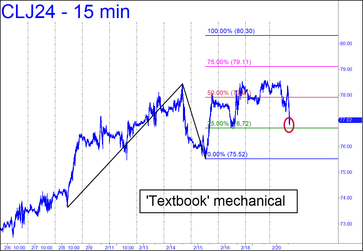 Crude is the most agitated trading vehicle I track, but paradoxically the easiest to trade. We can practically count on every tradable price reversal to come from within a tick or two of an in-your-face-obvious prior high or low — i.e., from smack-dab-in-the-middle of a ‘discomfort zone’. The pattern shown has a rally target at 80.30, and we know from experience that the political powers that be and their lackeys will be there to impede the uptrend, lest gasoline prices become problematical for voters nine months ahead of the election. The pattern is also an inch from triggering a textbook ‘mechanical’ buy at the green line. Watch it develop if you are bored. _______ UPDATE (Feb 23): The green line (x=76.71) could have been used to make as much as $2,200 per contract with little difficulty, since the futures made a nearly two-level move after dipping slightly below the line on Wednesday morning. A subscriber reported having used UCO to do the trade. Here’s the chart. The 80.30 target given above remains valid.