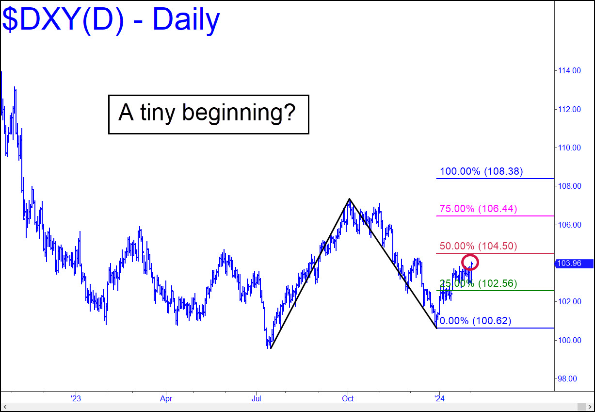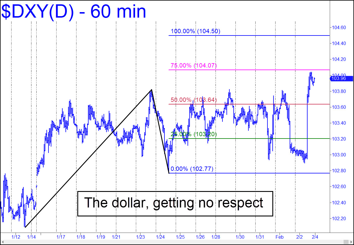For the deepest, most liquid trading vehicle on earth, the dollar has been getting precious little respect. The chart shows how it has been buffeted around, getting sand kicked in its face by the BRICs, Davos, Iran and who-know-who else. All that aside, the pattern shown has sufficient clarity to tell use whether DXY will remain a 98-pound weakling for yet a while longer, or instead embark on a recovery tour to the 108.38 target of this pattern. If so, a crucial test awaits at 104.50, which is a double resistance, the respective p and D Hidden Pivots of the two charts featured in this tout. _______ UPDATE (Feb 6, 1:05 p.m.): Rallies yesterday and today created two peaks that exceeded the double Hidden Pivot resistance by just a dime. My hunch is that the overshoot, tiny as it was, will suffice to keep the uptrend alive. However, we’ll need to see how strong the minor abcd corrective patterns are before we can judge more confidently whether a significant rally is under way. Whatever the case, it would become a ‘mechanical’ buy on a pullback to x=102.56.