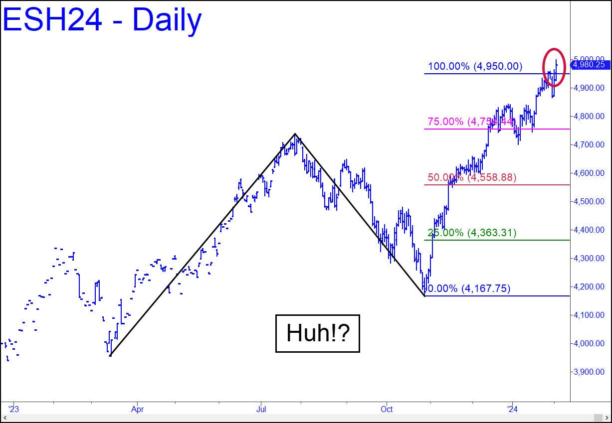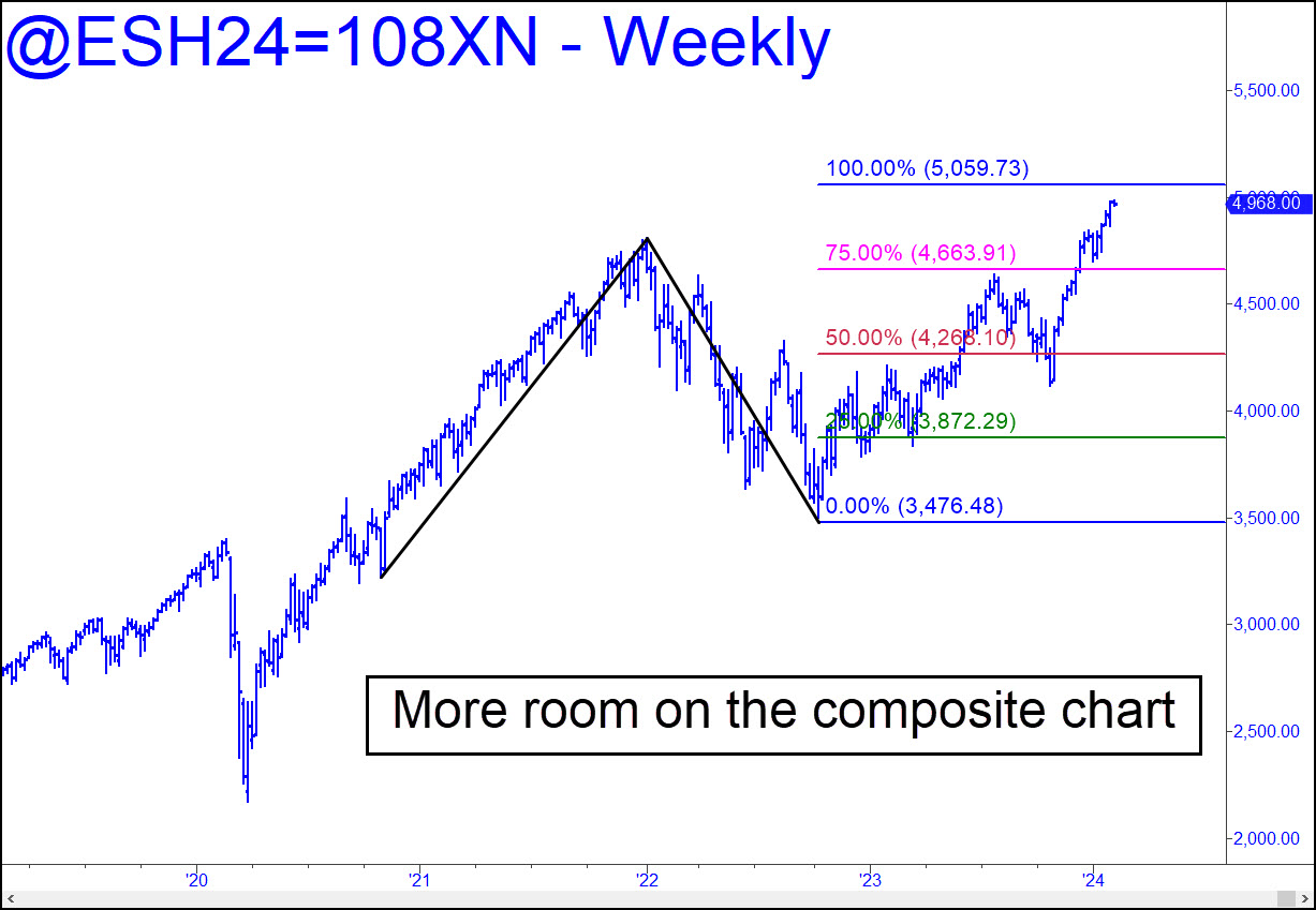 The futures were not supposed to blow past a target as clear and compelling as the one at 4950.00 shown in the chart. Yes, the pattern is too obvious to work precisely. But still. Regardless, we must now infer not only that at least somewhat higher prices impend, but that the ballyhooed one at 430.58 in MSFT may not show the stopping power I’ve given you to expect. Either that, or the 5059.75 target of the more expansive pattern shown here is in play. It will not work precisely because this is a continuous chart, but the target should be good enough for government work, meaning we can improvise a short up there if necessary, about 10-15 point higher on the March contract.