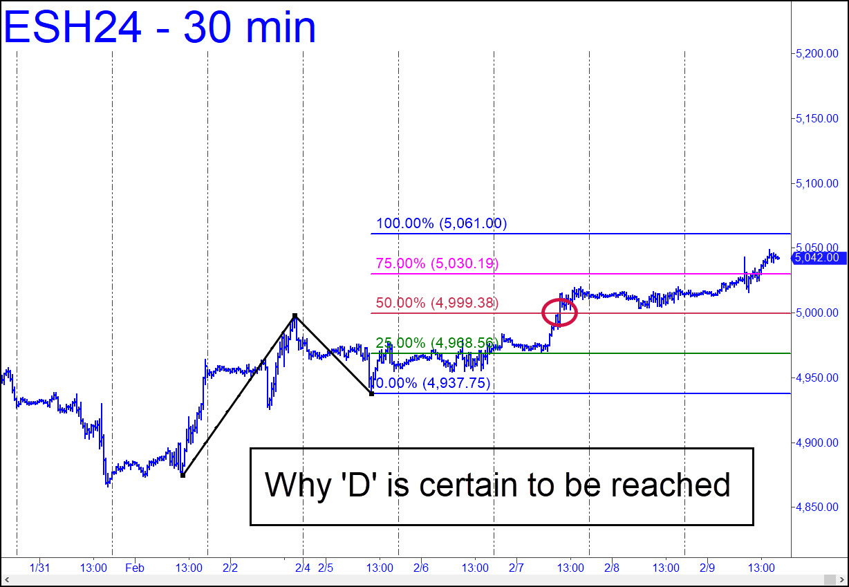 Here’s a picture I can’t recall having seen before — and on the weekly chart, no less. We would ordinarily expect buyers to have show deference toward the 4950.00 Hidden Pivot resistance, which could not be more clear or compelling. Instead, they plowed right through it last week, turning it into a launching pad to lengthen the previous week’s modest breakout. It’s possible this will turn out to have been brought on by the pattern’s obviousness. If so, the rally will not have much further to go until it sputters out. But the impalement of D has already been sufficient to suggest otherwise — i.e., that it is unadulterated, muscular buying that has turned the resistance into chop suey. Regardless, I’ll suggest using this extremely gnarly pattern to get a fix on the trend Sunday night/Monday morning. Price action at p absolutely guarantees D=5061.00 will be reached, at least. If it, too, gets blown away, bears had better get out of the way. However, if the futures into creep up to D Sunday evening or at the opening, you can try shorting there with a trigger interval (TI) as tight as 4.25 points.