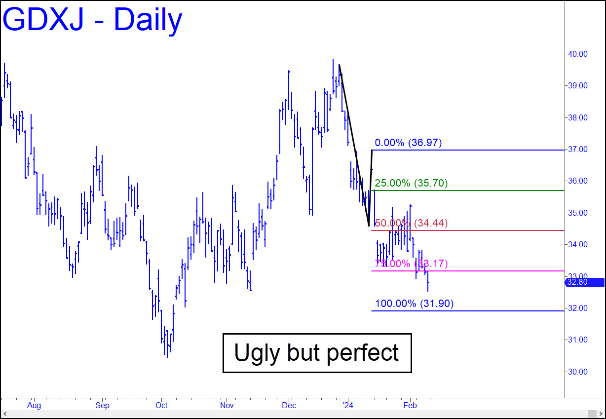 The pattern shown may not be pretty, but it is textbook-perfect for bottom-fishing. I hesitated to spotlight so promising a Hidden Pivot, since doing so is likely to impact its usefulness, but here it is anyway. The 32.05 low from October 10 could interfere, but possibly in a good way, since GDXJ would have to break down below it to actually set up a reverse=pattern buy. I will not mention this further in the chat room, nor even provide the target in this tout, but you can see for yourself where it lies, and you can use it to get long with risk very tightly managed. A trigger interval of 21 cents looks about right for the job.