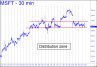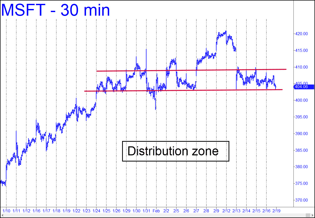 MSFT has replaced AAPL on the list for the time being, since its chart is more fun to look at. This is notwithstanding the tonnage that has been distributed between 403 and 410 over the last three weeks. It is real and it is heavy, but we know that DaBoyz are capable of rendering it insubstantial with a short-squeeze when conditions are right. My hunch is that they will still have to take the stock down by at least $3-$4 before they can set up the volumeless leap into a sunny-and-mild wafting zone above $410. We are still focused on a target at 430.58 (or possibly 437, which comes from the weekly chart) as the place where this aging bull market will seven out.