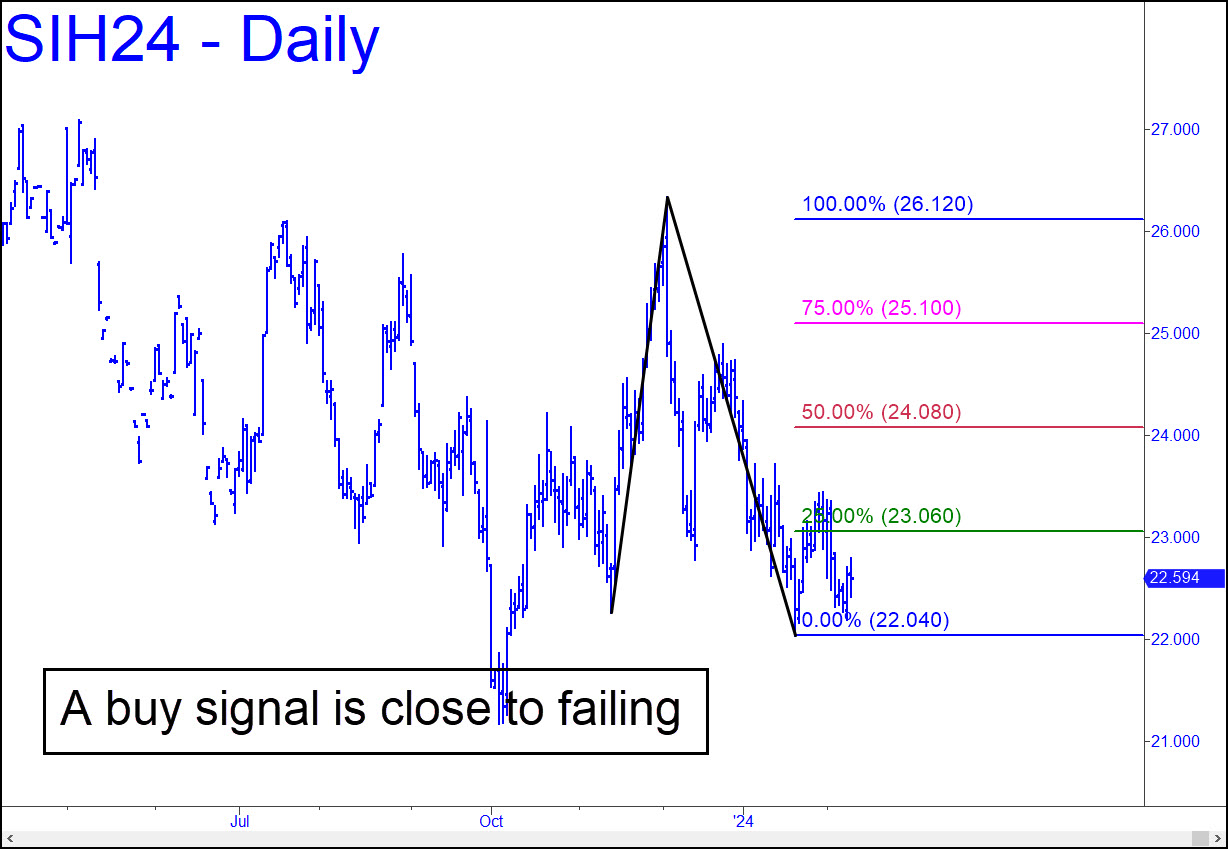 The futures are on a reverse-pattern buy signal triggered nearly three weeks ago at the green line (x=23.06). They haven’t done much since, other than disappoint, but the signal remains valid nonetheless until such time as the March contract drops below C=22.04. My gut feeling is that the trade will work, delivering at least a one-level ride to p=22.08. However, I’d be tempted to try again with a tighter reverse pattern if sellers should stop out C. A voodoo number sits about 30 points below it and could be useful for those inclined to trade this vehicle and who are familiar with voodoo set-ups.