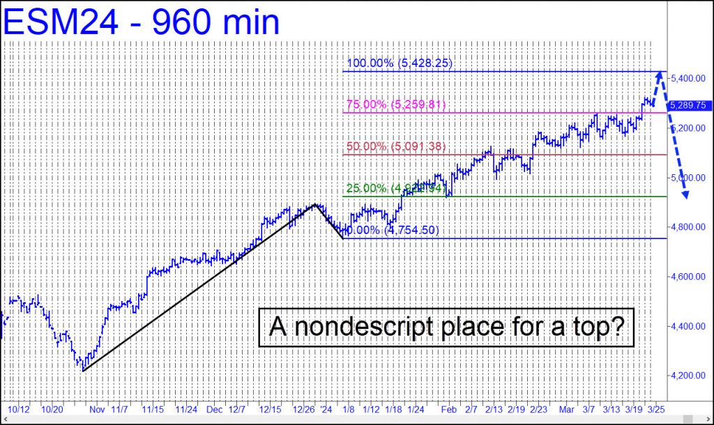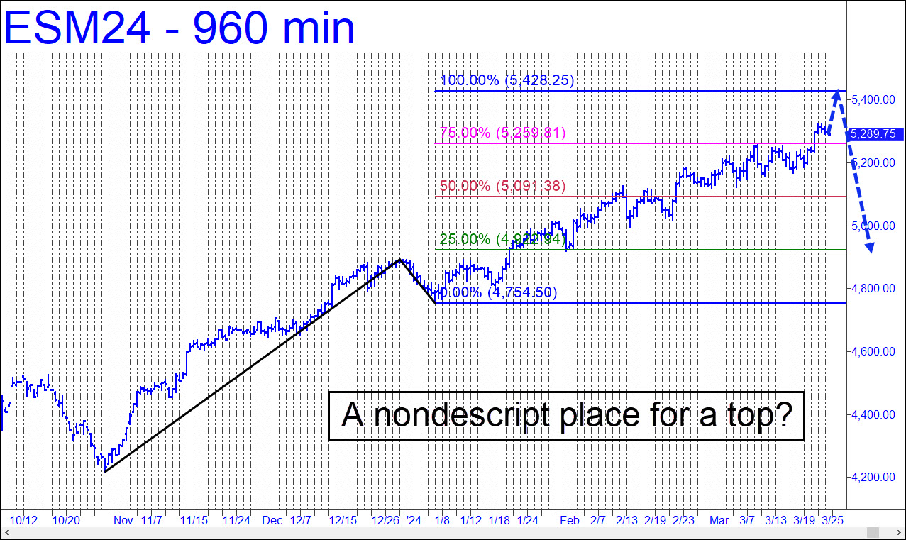 For now, set a screen alert as a reminder that 5428.25 is an opportune spot to short the E-Mini S&Ps. Even if there’s no immediate reaction, remember that bear markets do happen and that this bull is long overdue for a rebuke.