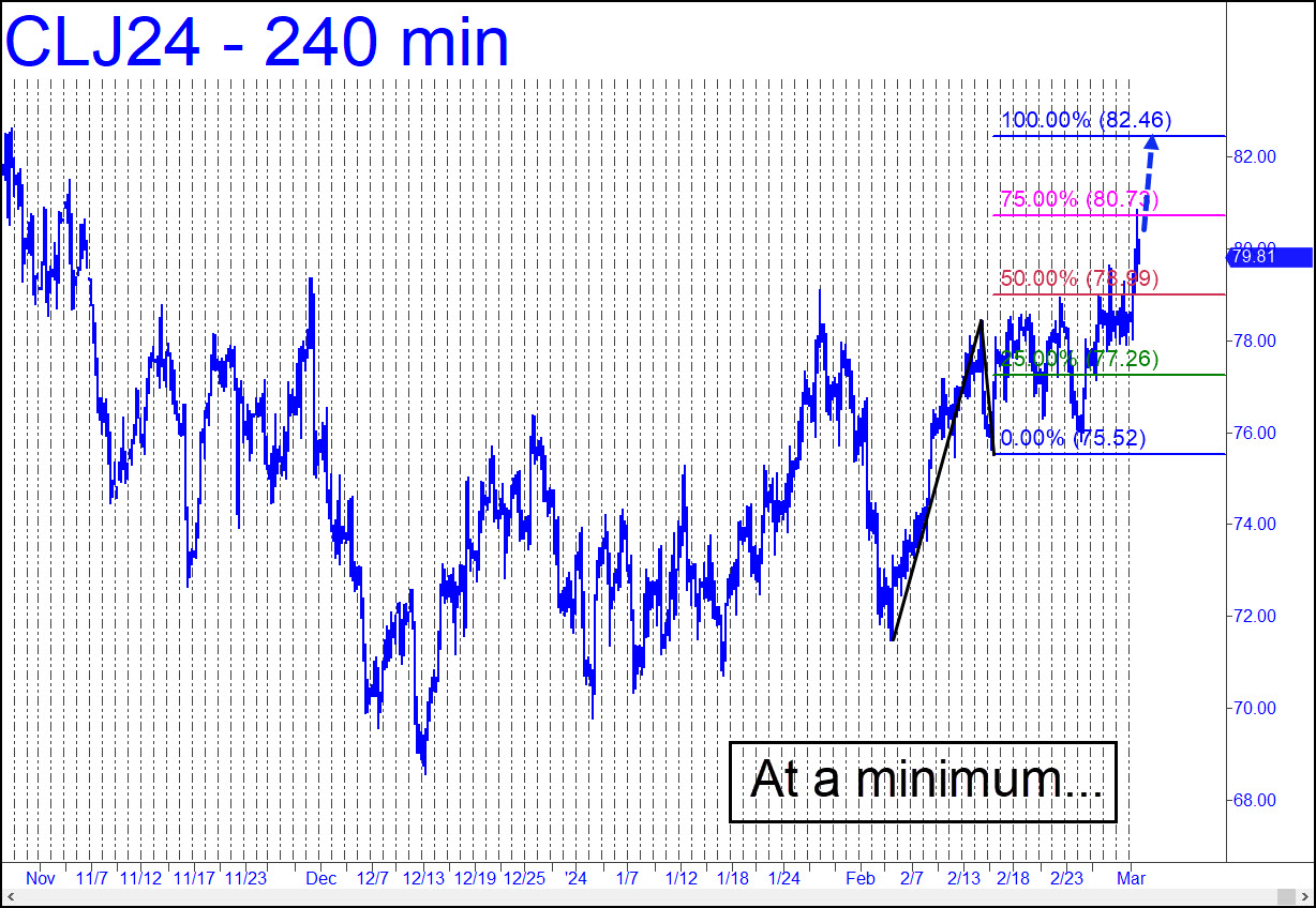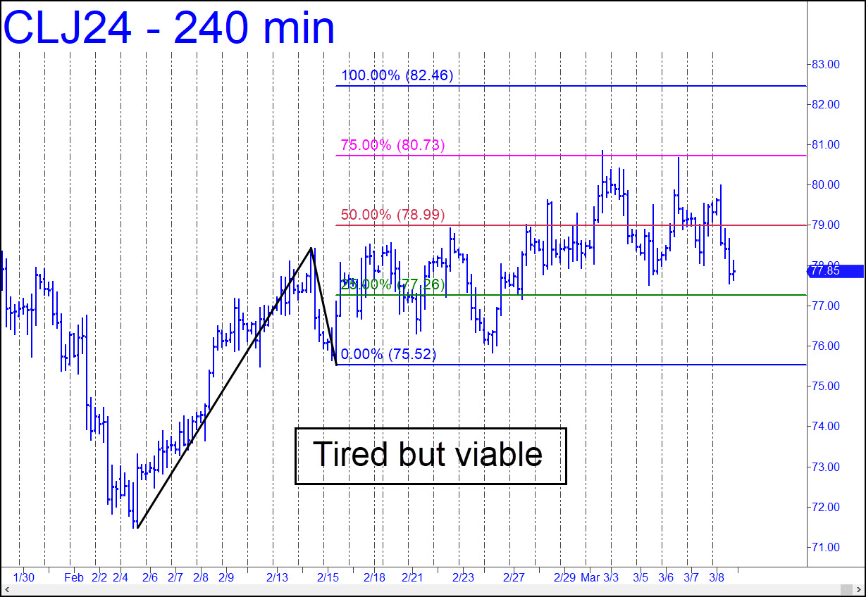 Crude’s tortuous rally since mid-December projects to 82.46, based on the ABCD pattern shown. It is good enough for government work, but as you can see, the point ‘B’ high failed to push above late January’s 79.09 high. This ‘sausage-y’ formation has been remedied by using a one-off ‘A’ low, although the result is a pattern that falls short of ideal. What makes it usable and even trustworthy is the pullback to the green line precisely from the midpoint Hidden Pivot (p=78.99). Now, a pullback to the red line can be bought ‘mechanically’ with a stop loss at 77.83. _______ UPDATE (Mar 9): Although the 82.46 rally target remains viable, the pattern’s C-D leg has grown too tired to offer a good opportunity for bottom-fishing with a ‘mechanical’ bid at the green line.