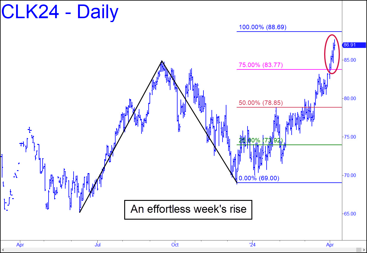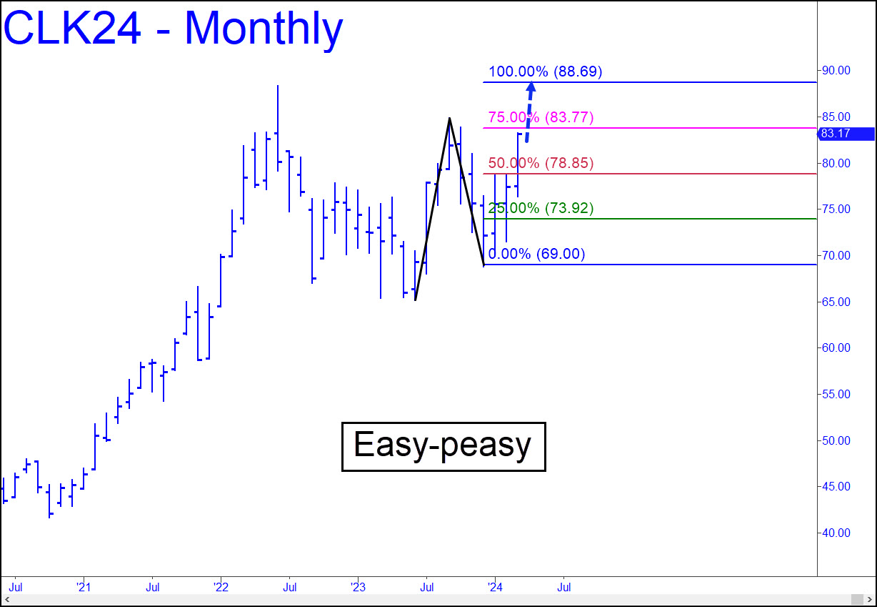 May Crude didn’t pull back nearly enough last week to fill the ‘mechanical’ bid I’d suggested. It still looks bound for an all-but-certain rendezvous with the 88.69 Hidden Pivot target shown. Although the rally stalled for a while precisely at the 78.85 midpoint resistance, once the futures finally got past it, there was no stopping or even slowing the ascent. A move to the target would exceed the 88.31 peak recorded in June 2022, creating a fresh impulse leg of monthly-chart degree. $100 crude, anyone? _______ UPDATE (April 6): The May contract shredded its way past p2=83.77, the secondary Hidden Pivot shown in this chart, all but guaranteeing the target will be reached. The stock market’s heedless ascent as soaring energy prices threaten to kick inflation back into overdrive ranks right up there with the crazed exuberance of the summer of 1929.