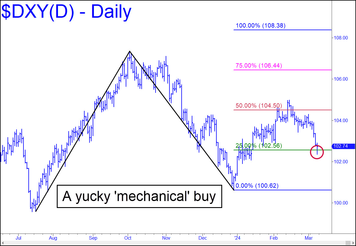 ‘Mechanical’ buying opportunities are not supposed to feel like opportunities, since the buying often occurs with the trading vehicle falling hard to the green line. The Dollar Index got hit three days in a row last week, sending it plummeting to x=102.56, where a ‘mechanical’ buy was signaled. Instead of leaping on the trade I’ll suggest paper trading it, the better to observe how an unappetizing possibility extricates itself from a bog. For the trade to work, DXY would need to rally to the red line without first dipping below C=100.62. _______ UPDATE (Mar 17): So far, so good: DXY has rallied from the green line and reached the midway point between the line and the midpoint Hidden Pivot at 104.50. At that price, taking a theoretical profit on 50% of the position would be in order.