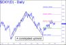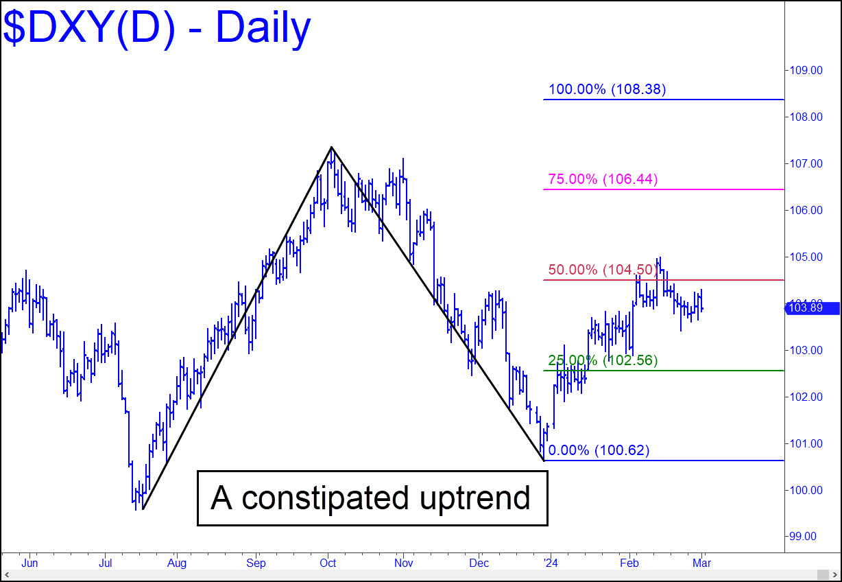 The Dollar Index has been on a buy signal since January, with potential over the next several months to D=108.38. A fall to the green line (x=102.56) would be widely interpreted as bearish, but as the chart makes clear, the move would be corrective and set up an attractive ‘mechanical’ buying signal. The struggle at the red line (p=104.50) suggests the dollar is in no hurry to reach D, with the possibility that it will not reach it at all, or at least not for a long time.