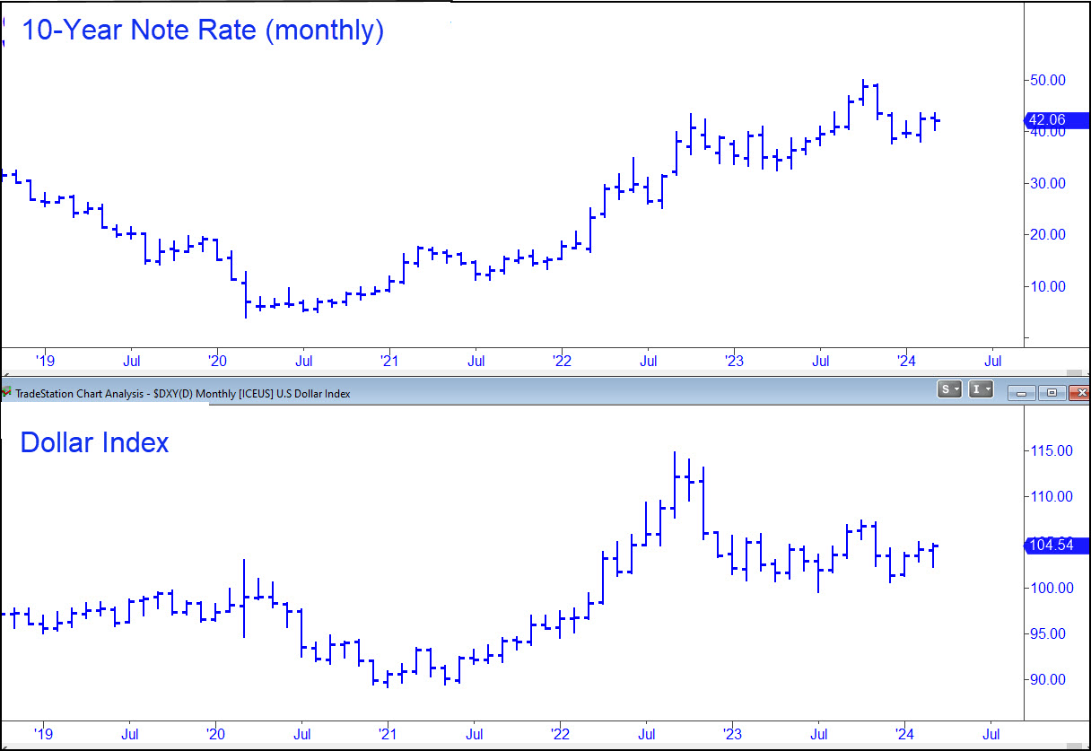 Although my deflationist outlook has kept me bullish on the dollar for decades, the two charts shown in the inset suggest that the greenback’s implied surge to punitive heights – for debtors — lies well down the road. It also seems doubtful that this will occur simultaneously with a leap in rates on the 10-Year Note, since they could not likely exceed the 5% heights achieved last October without sending the global economy into a tailspin. More likely is that the dollar will strengthen with real rates falling. For now, though, expect DXY to continue scuddling sideways between 100 and 110.