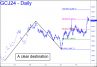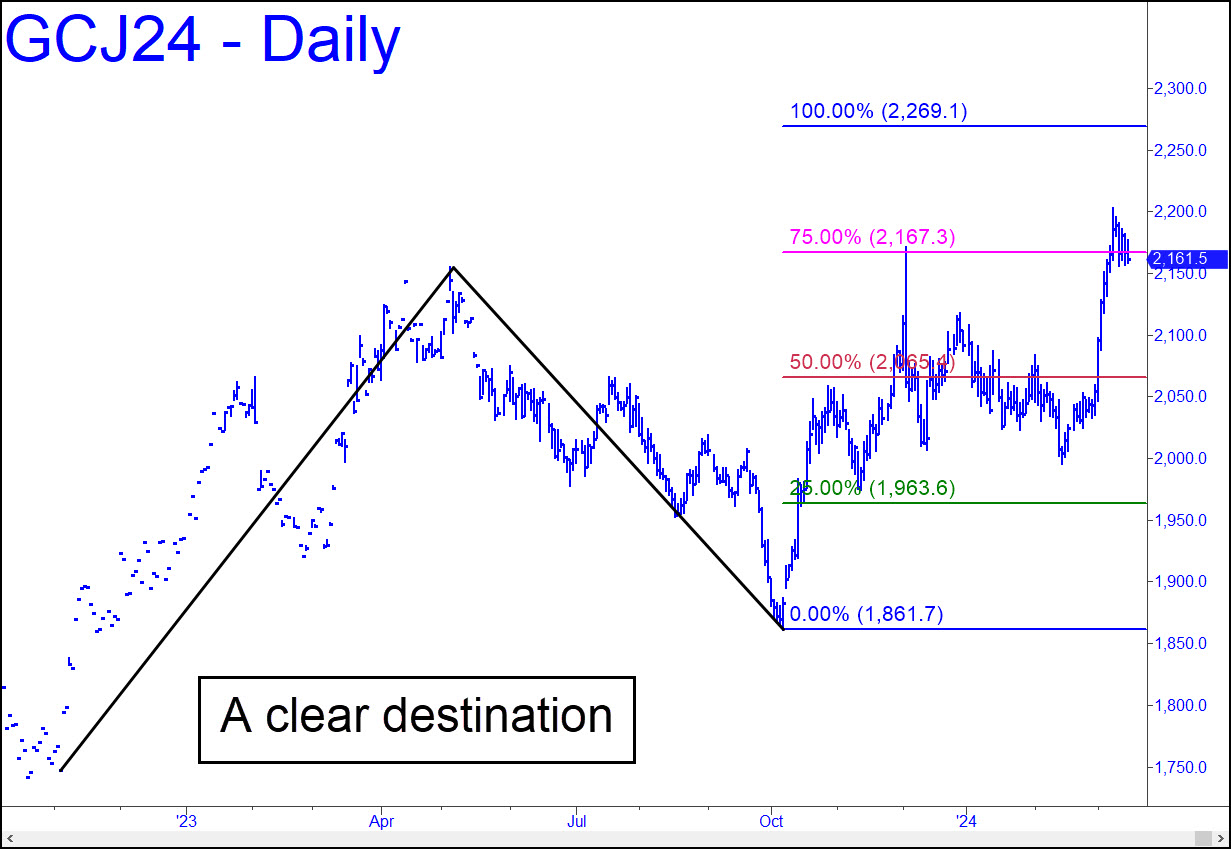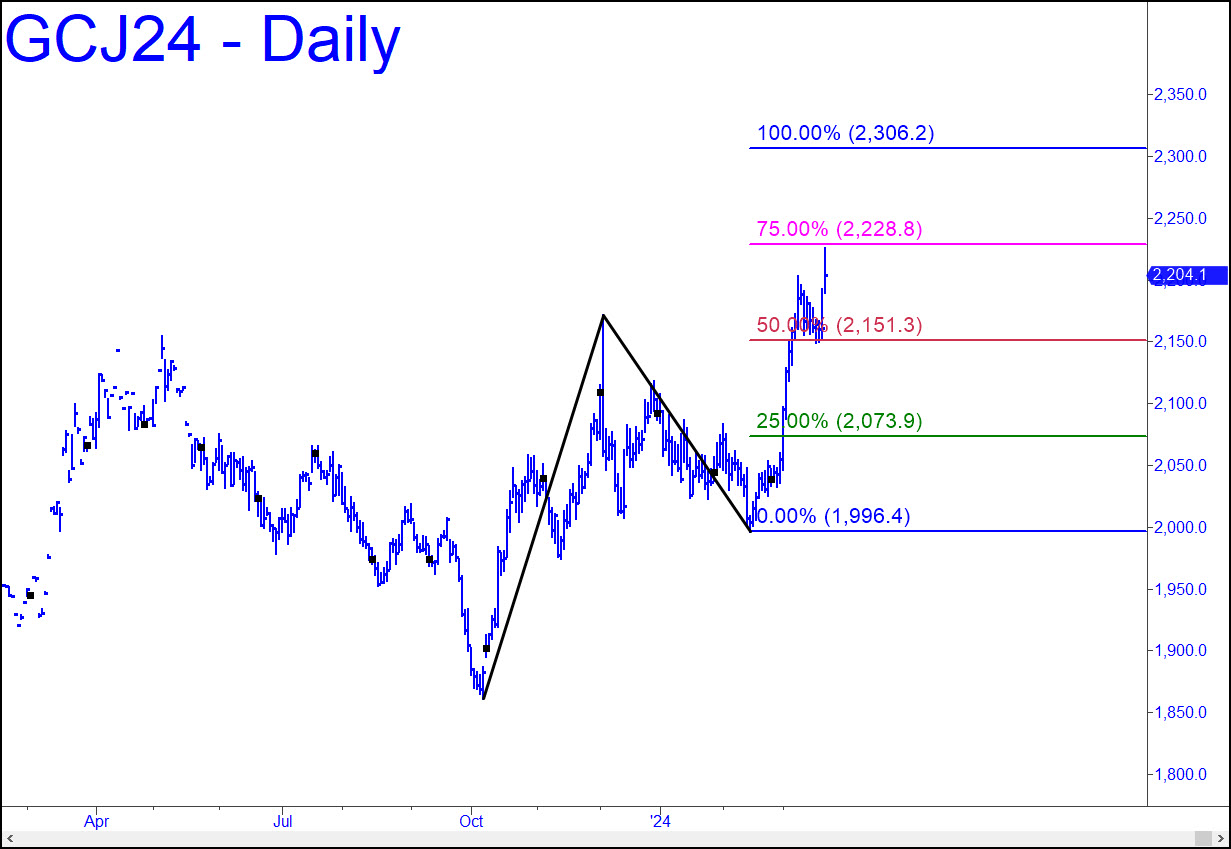 I’ve made a finicky adjustment to the point A low that yields a slightly lower rally target at 2269.10. Months of tedium at p do not allow certitude about whether D will be reached, nor does the stall precisely at p2=2167; however, my gut feeling is that 2269.10 will work as a minimum upside target. If April Gold gets no lift from last week’s soporific string of lows near 2159.40, the next place you could step in to buy with a tight stop-loss would be at 2116.00. That’s the ‘d’ target of a small reverse pattern on the daily chart. _______ UPDATE (Mar 21, 9:26 a.m.): The futures should be presumed bound for the 2306.20 target shown in this chart once they push decisively past the 2269.10 Hidden Pivot resistance noted above.