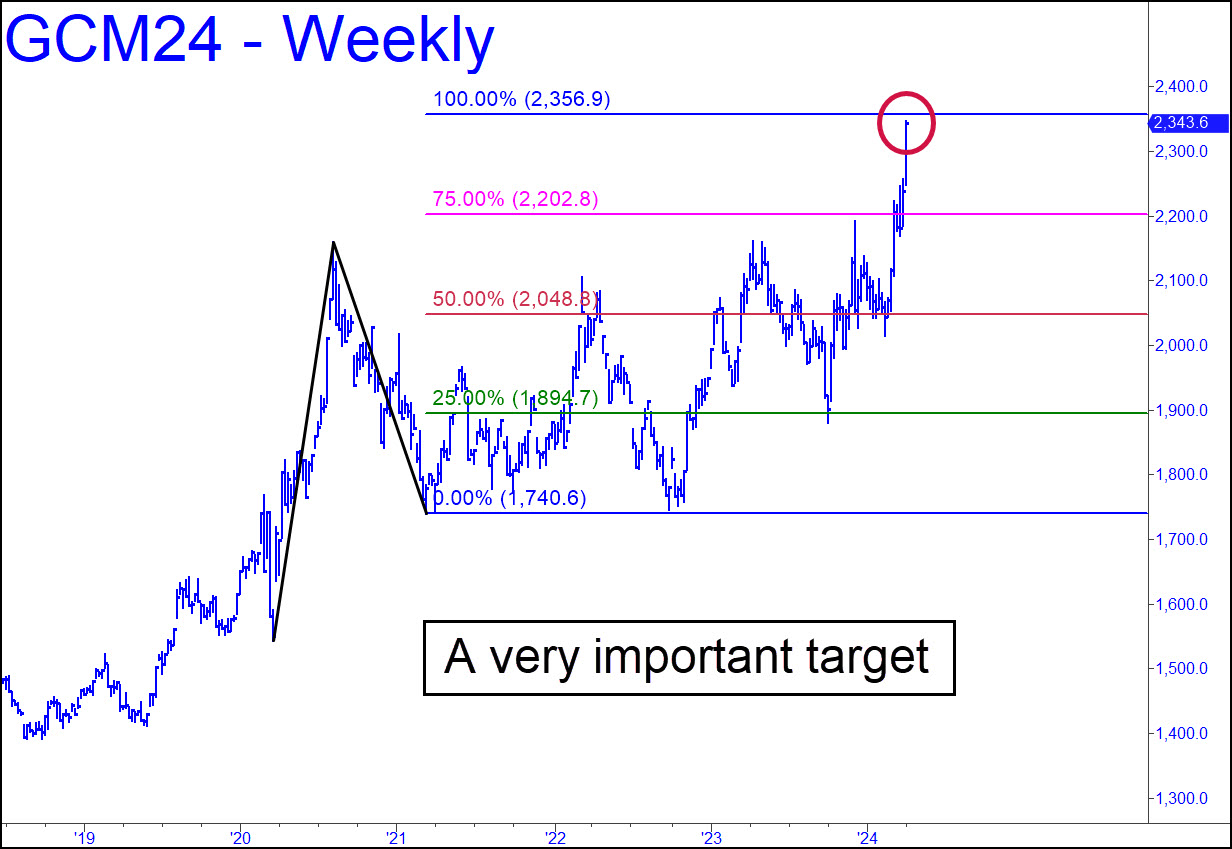 The 2306.40 rally target we’ve been using for nearly a month looks like a lock-up at this point. April Gold’s ascent has been so urgent that there was only one ‘mechanical’ opportunity to buy a pullback on the daily chart. That occurred with a dip that barely brushed the red line, never mind fell to the green one. Friday’s stab above p2=2228.30 was further evidence that a run-up to D has become all but unavoidable. Even so, we should pay close attention to price action near 2290.80, the target of a much larger pattern on the weekly chart. Although I expect the futures to get past it, the closely coincident location of the two targets implies that an important top could form at the 2300 level. Note: The equivalent D target for August is 2344.60, _______ UPDATE (Apr 5, 11:28 a.m.): The June contract is closing on a potentially VERY important target at 2356.90! Here’s the chart.
