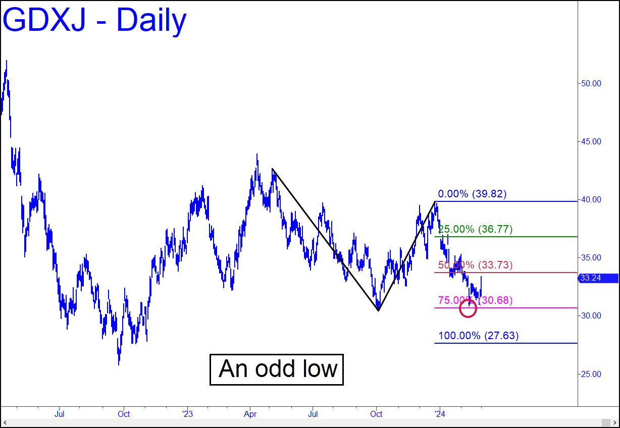 Although my immediate outlook for gold futures is bullish, Friday’s thrust in this vehicle looks like a fake. It would have gotten more boost if it had occurred from just beneath October’s 30.46 bottom, and that is where I expect DaBoyz eventually to engineer an authentic turnaround. More immediately, GDXJ would become an appealing ‘mechanical’ short at either the red or green line. We’ll pass up the opportunity but use these benchmarks nevertheless to gauge trend strength. _______ UPDATE (Mar 5, 6:35 p.m.): The bullish reversal from last Wednesday’s low turned decisive with today’s pop through an ‘external peak at 35.25 recorded more than a month ago. It is still more bullish because the low failed to come down to p2=30.68.