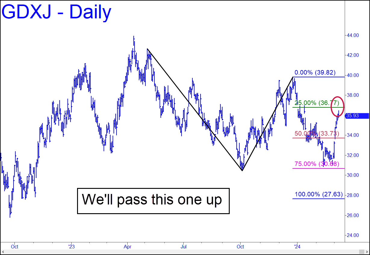 It’s hard to be cautious after last week’s steep, powerful rally, but we should take heed nonetheless that GDXJ would trigger a ‘mechanical’ short at x=36.77. I am not suggesting this, since the set-up, with a weak but lengthy impulse leg, is hardly ideal. But we should monitor price action closely after it’s hit, since that’s why we use charts in the first place — i.e., to stay objectively on top of the trend no matter what we might think.