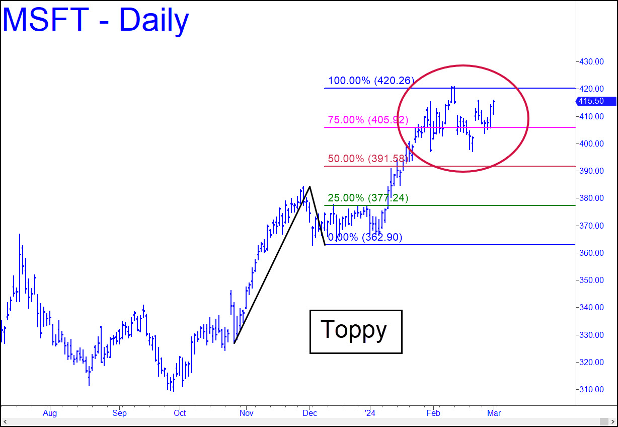 We have an unfulfilled target on the weekly chart at 430.58. However, I’ll treat the one at 420.26 shown in the inset as a possible major top until such time as it is exceeded. Paying too little attention to it cost me dearly when I failed to exit a profitable calendar spread held during the Option Experiment. There is a potential voodoo short from beneath the high, so stay tuned to the chat room and your email notifications if you’ve been itching to buy put options on this stock.