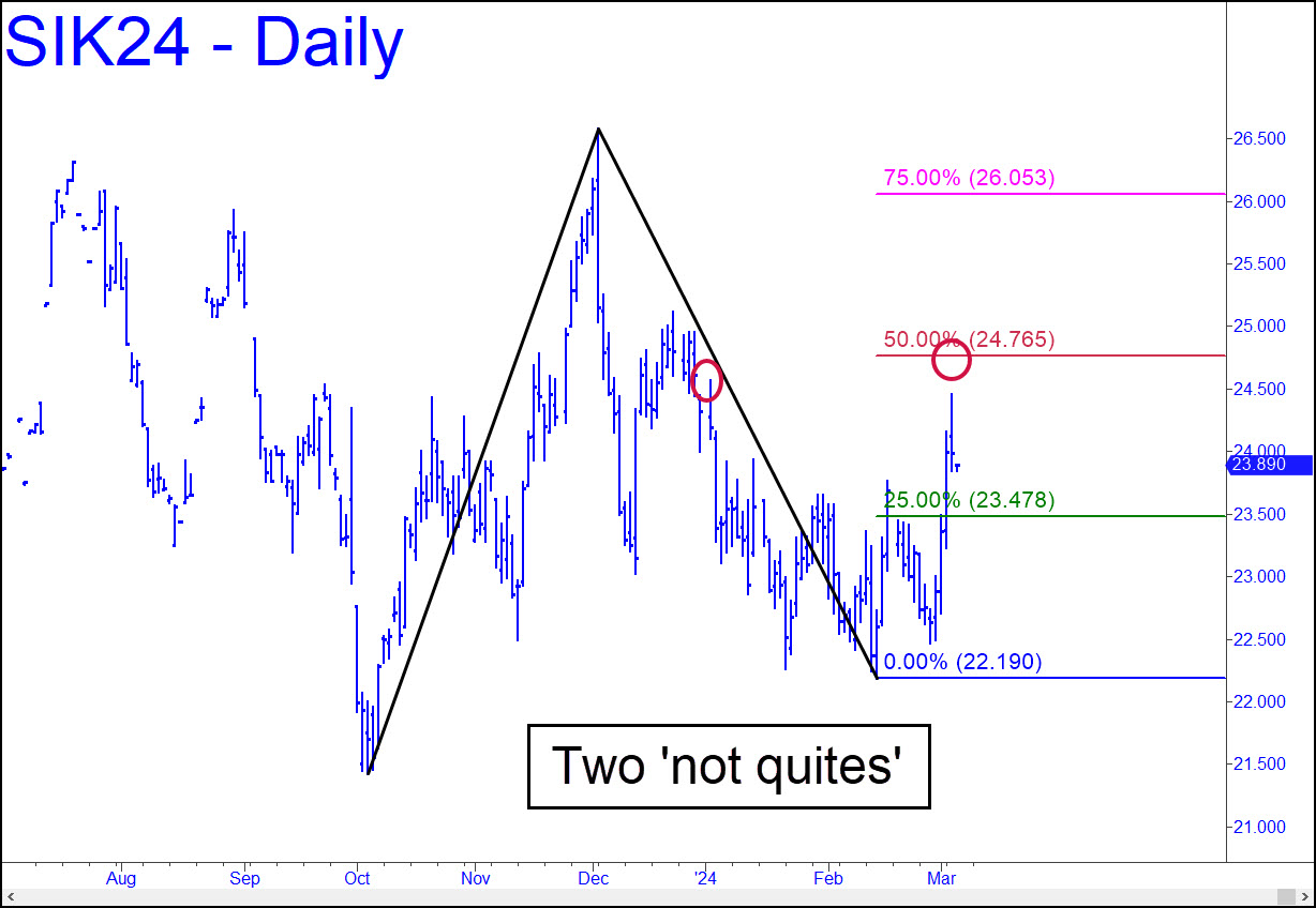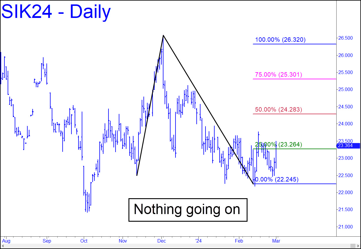 Silver badly lagged gold on Friday, but I’ve given it the benefit of the doubt nonetheless with a bullish rABC pattern that can be used to trade the May contract. Minimum upside is to p=24.28, with a D target at 26.32. The pattern is gnarly enough to be used for positioning a ‘mechanical’ bid on any one-level pullback. As always, a decisive thrust past p would imply the target is likely to be reached. ______ UPDATE (Mar 5, 6:30 p.m.): Silver continues to lag gold, but not badly enough to worry about. Today’s strong start exceeded the D target of a minor pattern but still fell short of p=24.76 of this pattern and an ‘external peak at 24.56 from January 2. Look for the correction to come down to 23.16 and reverse if it exceeds 23.80.