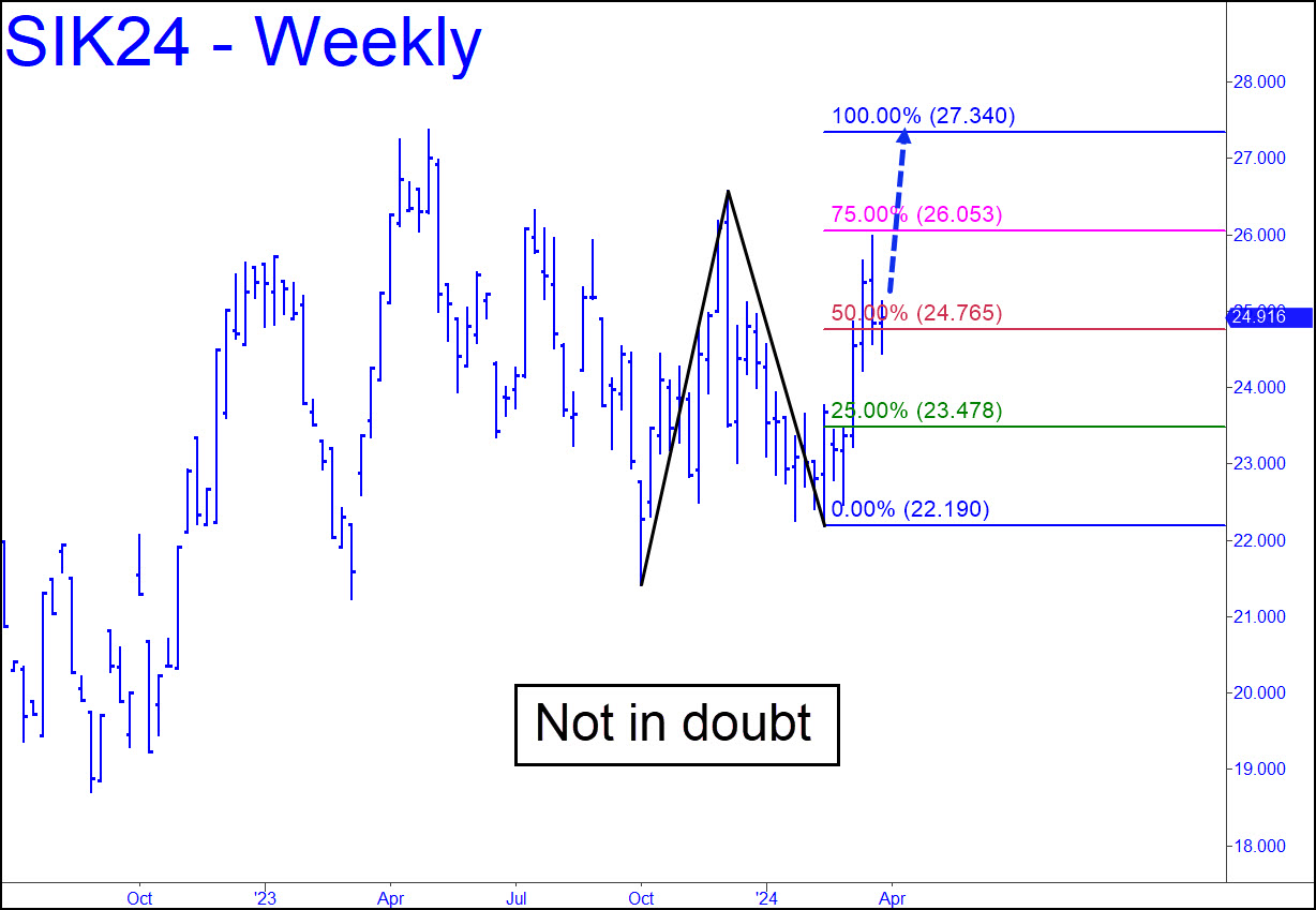 Last week’s tedious grind eked out only a minuscule gain, but that will have little bearing on the still-strong likelihood of the 27.34 target being reached. A pullback to the green line (x=23.47) would trigger a high-caliber ‘mechanical’ buy, but it seems unlikely that Mr. Market will gift us with such a succulent opportunity. There will always be opportunities to get long intraday, however, so you should stay close to the chat room and your email Notifications if this vehicle interests you. _______ UPDATE (Apr 3, 10:36 a.m.): Two powerful upthrusts have brought May Silver within easy distance of the 27.34 target. If it is easily penetrated, expect more upside to 27.55, a more daunting Hidden Pivot resistance (Daily, A= 21.24 on 3/8).