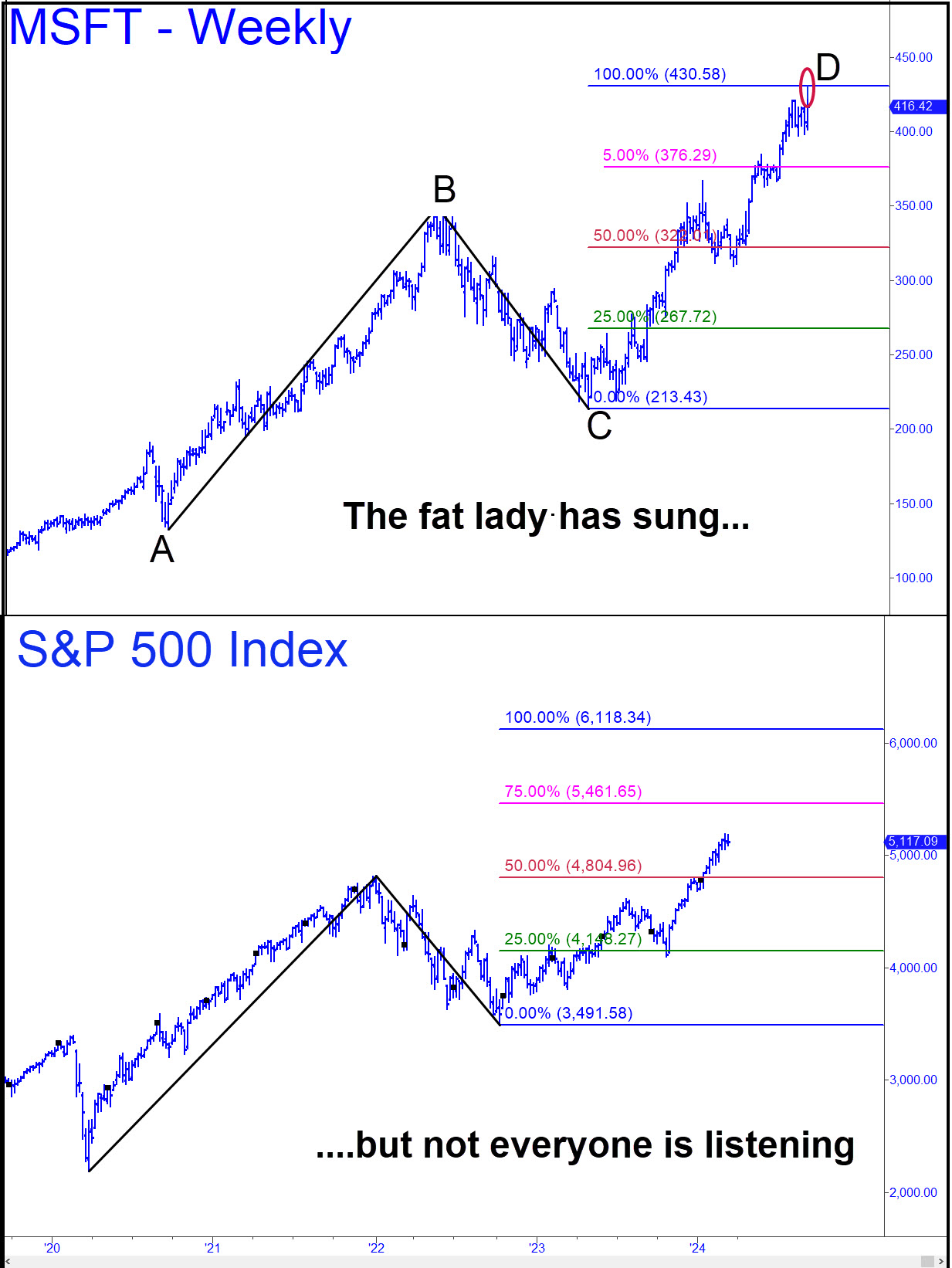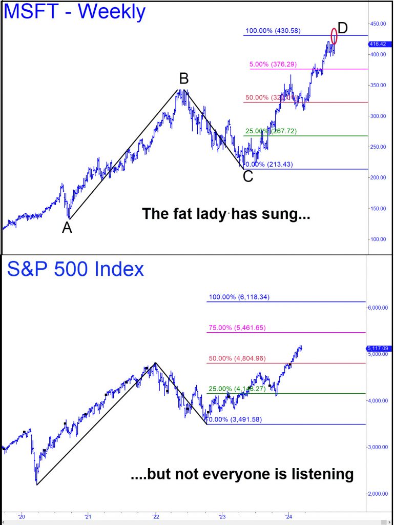 For nearly a year, I’ve promoted the idea that the post-covid bull rampage would end when Microsoft shares hit $430. They effectively achieved that benchmark on Friday with a pre-dawn print at 428.95 that gave way to a $16 plunge. If this was not THE top, it certainly felt like A top, and a potentially important one. However, before we draw any conclusions, let’s see if the selloff gets legs, since we don’t want to underestimate the power of a market that has been in the grip of mass psychosis since October. If there were any doubt about this, consider how stocks have rallied into the Fed’s decision to stay tight even after investors had deluded themselves into expecting aggressive easing in 2024.