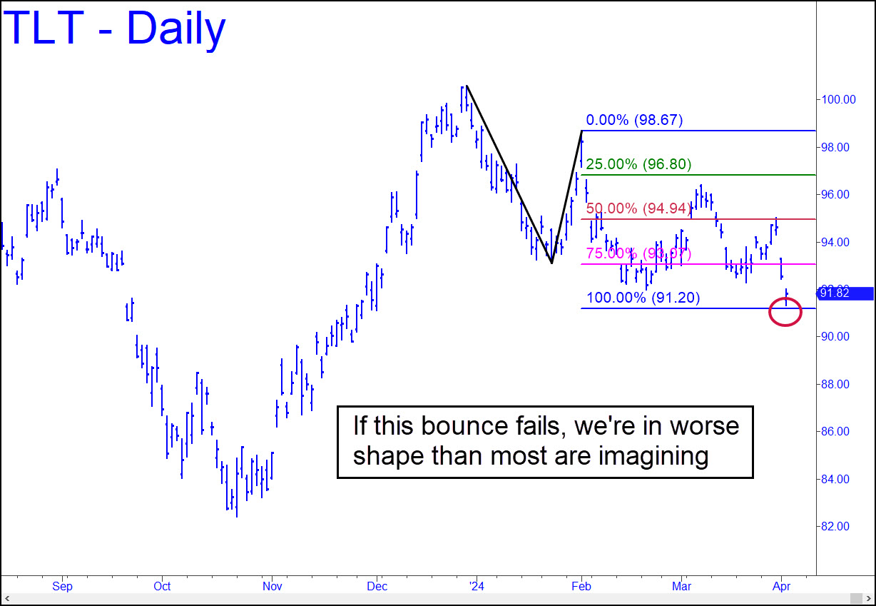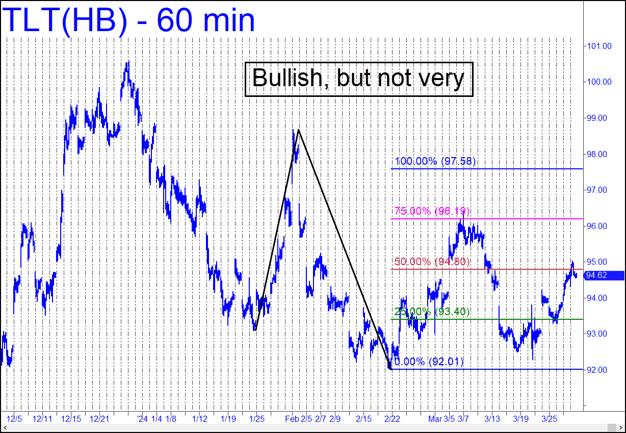 The ‘mechanical’ trade that triggered three weeks ago with a drop to x=93.40 has survived a brush with death that saw it fall to within an inch of being stopped out below C=92.01 of the pattern shown. Since then, TLT has achieved a solid gain following a theoretical ‘mechanical’ entry at the green line. A further run-up to D=97.58 looks like no worse than an even bet at this point, but we’ll wait to see more price action at the red line before we attempt to winnow down the odds. Should I keep this symbol on the core list? WordPress failed to publish the TLT tout I’d prepared last week, but no one noticed it, including me. ______ UPDATE (Apr 2, 10:52 a.m.): Two huge gaps to start the week have put TLT in a freefall. This morning’s moderate bounce has come from within a hair of a crucial Hidden Pivot target at 91.20, but if it fails, look out below!