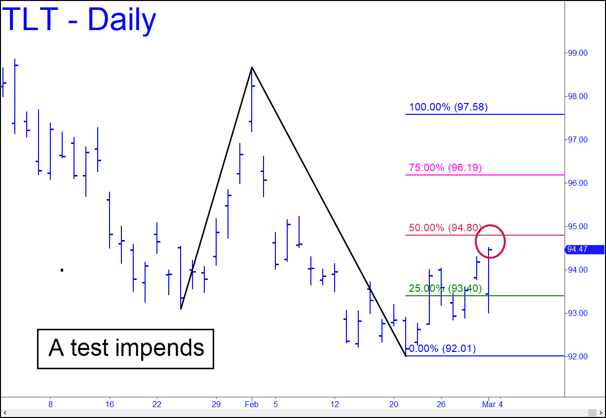 T-Bonds have been on a theoretical buy signal since February 23, when this vehicle popped through the green line (x-93.40). The minimum upside objective is p=94.80, but we’ll be more interested to see how buyers interact with that ‘hidden’ resistance than in trading GDXJ. A quick and decisive push past it would provide a tailwind for a move to as high as 97.58 over the next several weeks. _______ UPDATE (Mar 9): Last Tuesday’s gap through p=94.80 all but guarantees the rally will reach a minimum 97.58, the ‘D’ target of this pattern. An easy move through that Hidden Pivot resistance would imply that the bull cycle begun from 82.42 last October is about to surge anew.