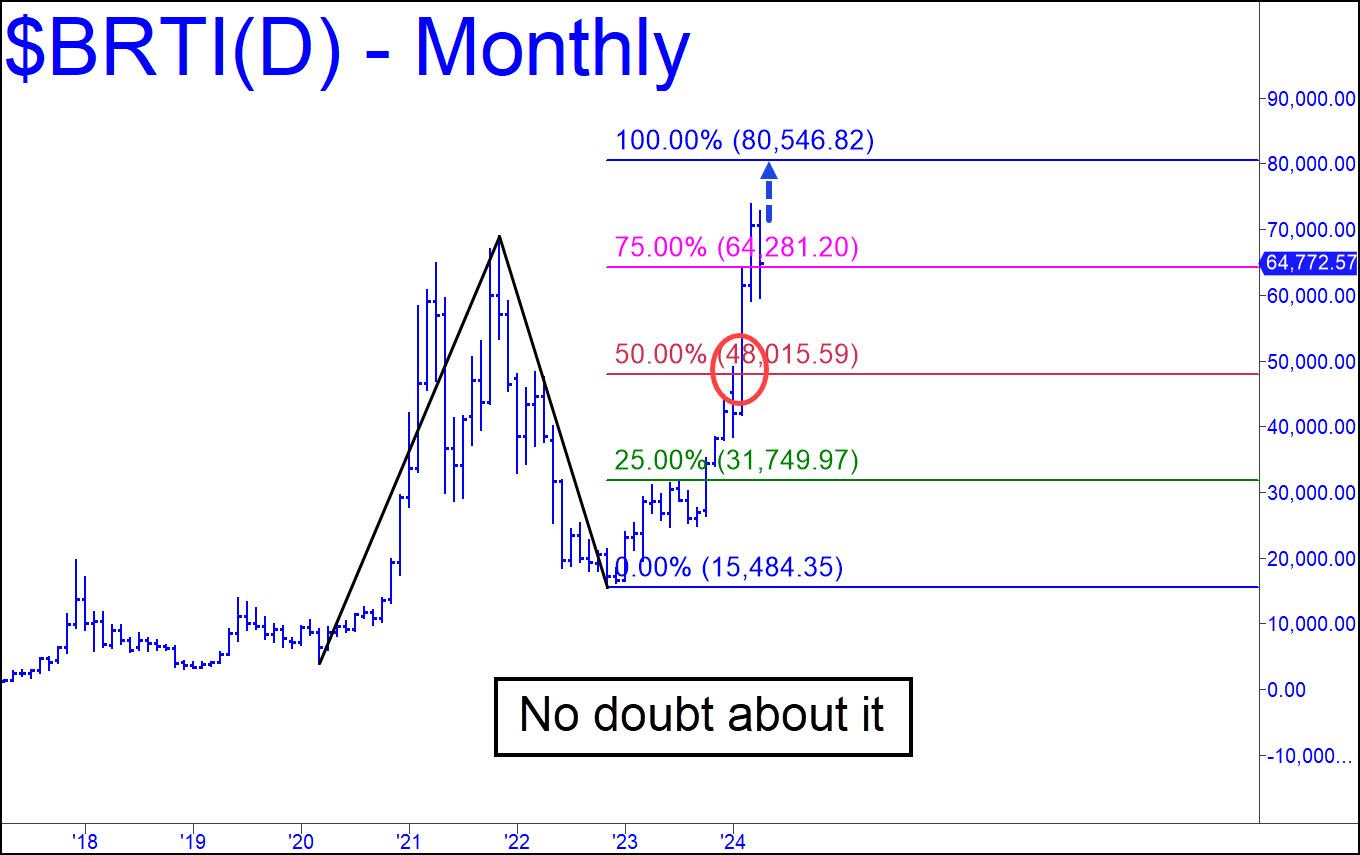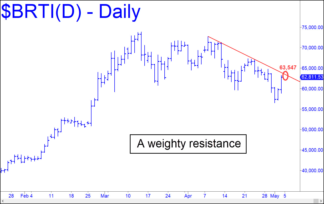 I still expect bitcoin to make an important top at 80,546. My confidence is based on the ease and decisiveness of the move through p=48,015. Although there was a brief stall there, Bertie not only popped through it on the next bar, it also came close to touching p2 on the bar before finishing just below it. Taken together, these factors suggest that the D target has a high probability of being achieved. Also, because there are no alternatives for the A, B and C coordinates shown – i.e., the pattern is ‘locked’ — 80,546 is likely to work precisely as a reversal spot. Meanwhile, a pullback to p=48,015 should be viewed as a ‘mechanical’ buying opportunity, stop 37,171. There are ways to cut the entry risk by at least 90%, so don’t hesitate to seek timely guidance in the chat room if the opportunity should materialize during regular-session hours. _______ UPDATE (May 5): If the latest shakedown to 56,519 was prelude to the move I’ve been predicting to at least 80,546, Bertie should push decisively past the trendline shown in this chart, and soon. It will come in around 63,684 when the week begins, with a declining slope of about 170 points a day.