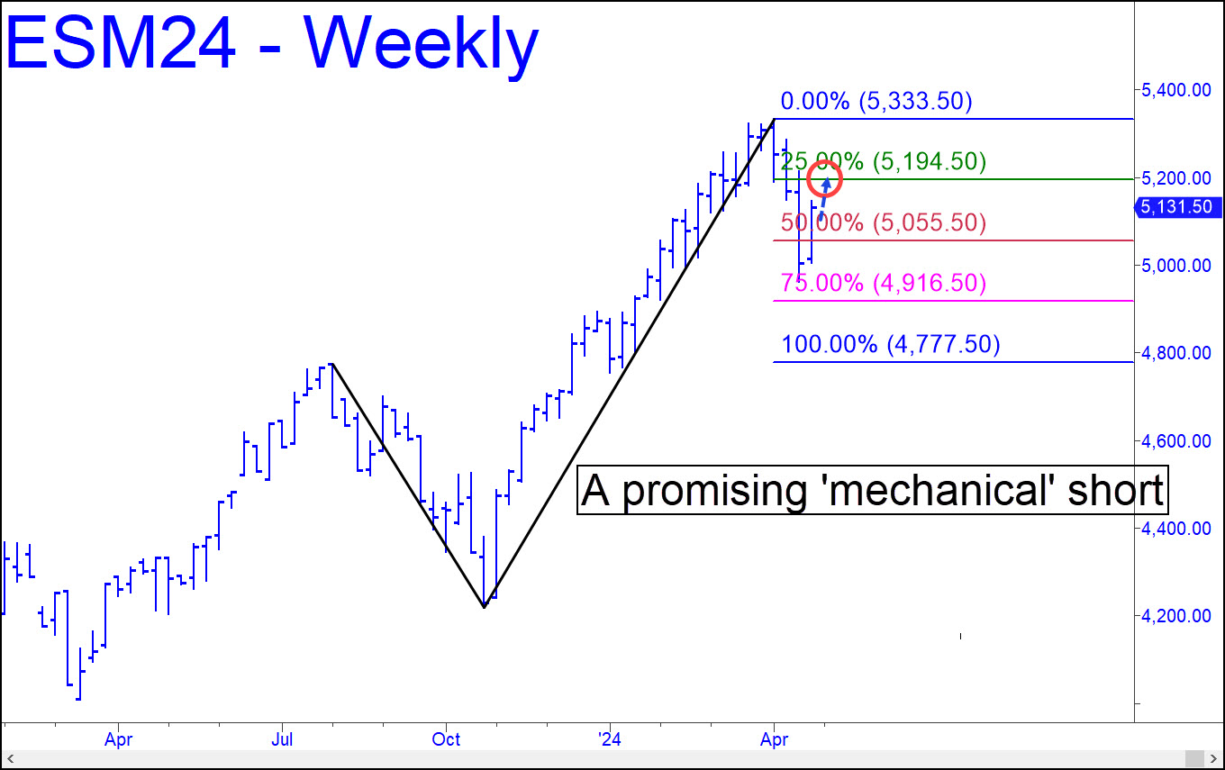 The bounce begun last week from 4963 promises to set up the juiciest shorting opportunity we’ve seen in this vehicle since last July. The rally has come almost precisely from the sweet spot of the rABC pattern shown, implying that if it touches the green line, a ‘mechanical’ short from there has a better chance of achieving D=4777.50 than getting stopped out above C=5333.50. The pattern has been useful so far, having correctly signaled the drop that occurred after a theoretical ‘conventional’ short was triggered on the initial fall through the green line. The new trade is recommended only to subscribers who are comfortable with ‘camouflage’ triggers that can cut the entry risk by as much as 95%. In this case, the implied 139-point stop loss carries theoretical risk of nearly $7,000 per contract.