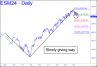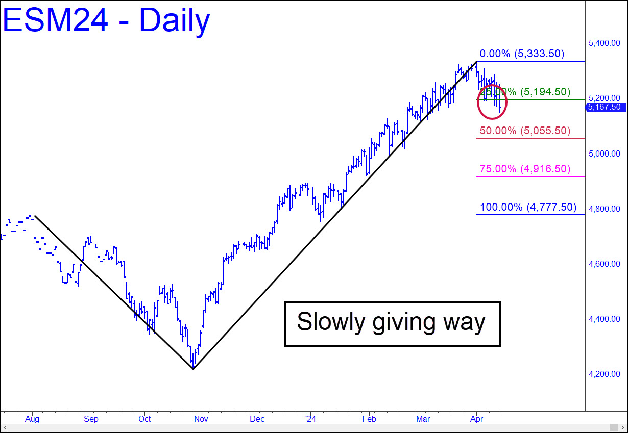 Bulls have gotten dragged lower for the last two weeks, kicking and screaming every inch of the way. However, I doubt they’ll avoid the punitive implications of the reverse pattern shown, with a 4777.50 target that lies 7.5% below Friday’s settlement price. It might not turn out so badly, though, since the midpoint Hidden Pivot at 5055.50, which has served lately as our minimum downside objective, could conceivably contain the correction. But if it is decisively exceeded, we shouldn’t hesitate to short a rally back up to the green line aggressively.