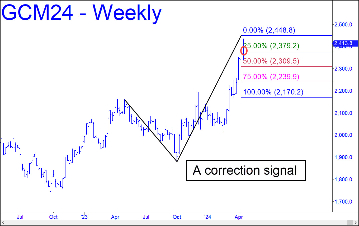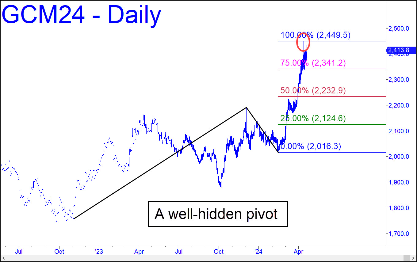 I only belatedly discovered the reason for the hard selloff a week ago from 2448.80. That number lies just 0.70 from the target of the very gnarly pattern shown. I still think the June contract has a better than 50% chance of achieving a somewhat higher target at 2514.60 given here earlier. However, we should be very cautious at the moment, since this corrective pattern on the weekly chart suggests the June contract will fall to at least 2309.50 before it finds traction. Worst case would be 2170.20, and we cannot rule it out, but we’ll be looking to bottom-fish at p=2309.50 (slightly adjusted from last week) in any case. _______ UPDATE (Apr 23, 1:35 a.m.): The clowns/thieves/Masters of the Universe who erroneously believe they are manipulating this vehicle were themselves manipulated into a nearly $40 plunge when June Gold fell Monday night to a so-far low at 2308.70 — less than $1 from the Hidden Pivot target I’d flagged above. The $19 bounce that has occurred so far would need to hit 2348.00 to move the futures out of the danger zone; otherwise, look for a further drop to at least 2239.90 (see my chart), a Hidden Pivot support that can be bottom-fished as aggressively as the one at 2309.50.