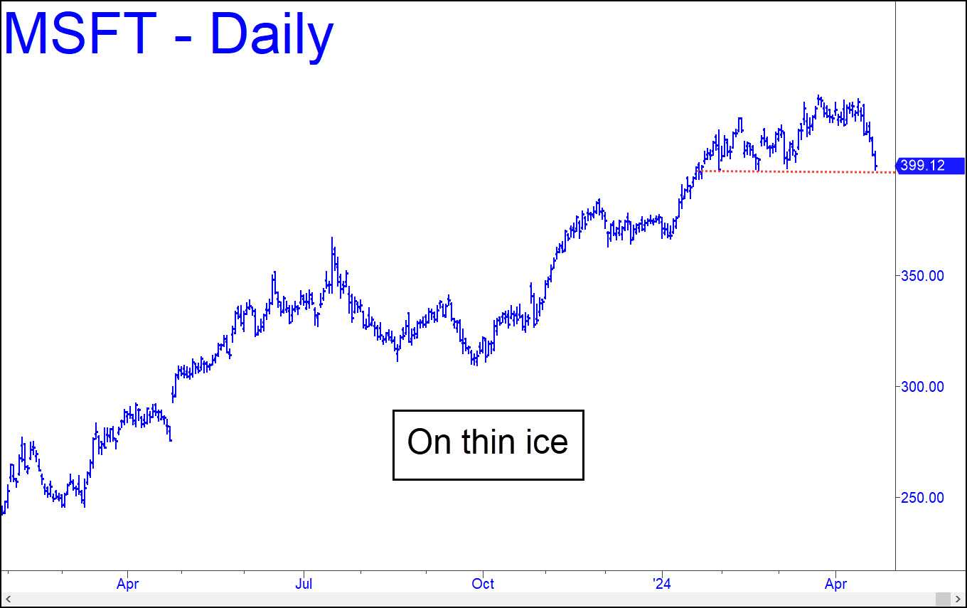The stock’s steepening fall last week put more distance between it and the all-time high a month ago at 430.82. That was just 24 cents from a longstanding target I’d said could cap the bull market begun in 2009. Perhaps it has, although I’d like to see MSFT fall at least 30%, to $300, before I consider the prediction fulfilled. Odds of this will shorten if the new week begins with just slight weakness. Anything exceeding 397.21 to the downside would breach three (!) external lows on the daily chart, creating a powerful impulse leg with devastating potential.