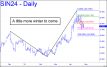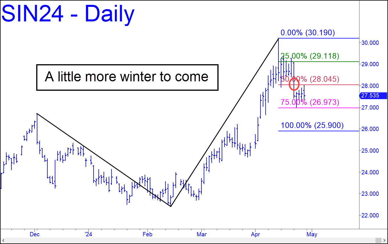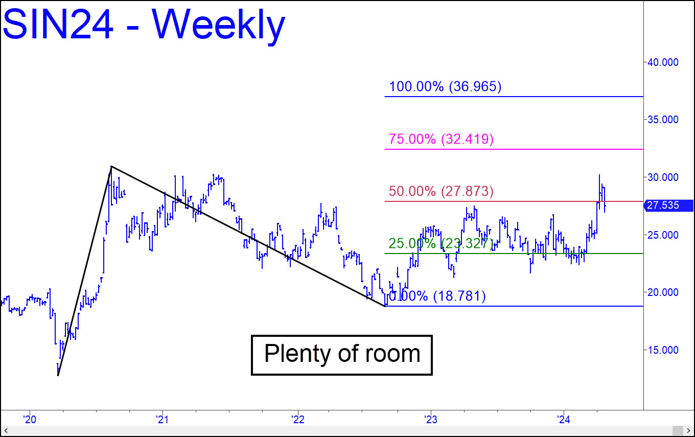 July Silver’s weekly chart allows room for a 34% rally to 36.96. In order to extrapolate a comparable move in gold, we need the help of an extremely gnarly pattern on the continuous monthly chart that projects a 28% rally to 2995.00 (A= 681.00 on 10/31/08, B=2063 on 8/31/20). More immediately, July Silver’s correction from the 30.19 high recorded on April 12 appears bound for a minimum 25.90. (This would imply that gold’s correction has further to go.) The provenance of this target is shown in the thumbnail chart. The decisive downside breach of the rABC pattern’s midpoint pivot (28.04) implies not only that D=25.90 will be reached, but that an intervening rally to x=29.12 would offer a tempting opportunity to get short ‘mechanically’.