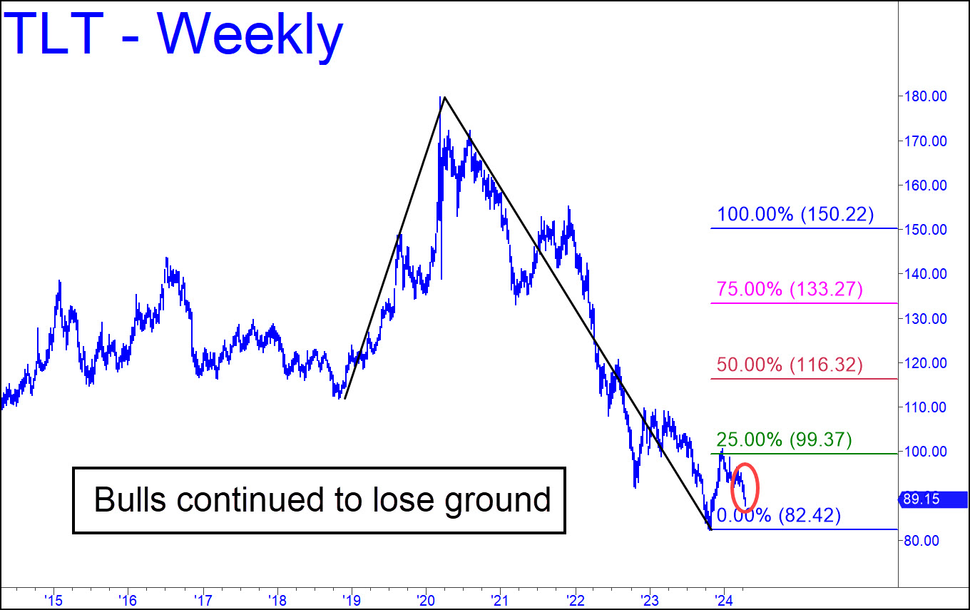 Bulls continued to lose ground last week, but the weakness was not quite sufficient to push this vehicle beneath the 82.42 point ‘C’ low of the bullish pattern we have been using speculatively. If the pattern were to hold sway, which is looking increasingly doubtful, an extended uptrend could take TLT as high as 150.22. That implies a spectacular bull market, one driven by vanishing inflation and expansionary yield curves. This seems so unlikely at this point that we should view any upturn in TLT with caution, if not to say suspicion, Realize in any event that it would not be unusual for a bull market to be born in obscurity and for no apparent reason.