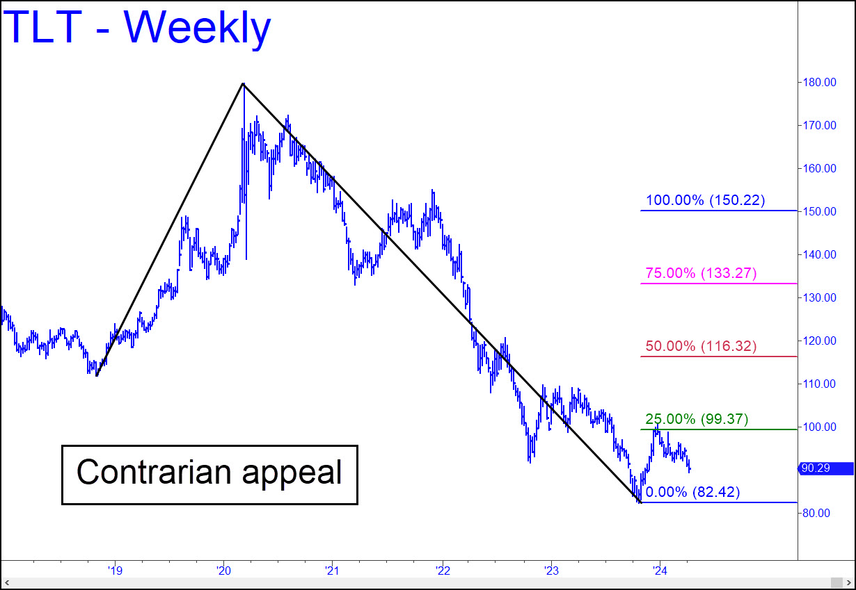 TLT looked like hell again last week, as usual. However, I will accentuate the positive for a rare change, as I did in this week’s commentary featuring T-Bond futures. Turns out 2024’s downtrend in both vehicles occurred within the context of respective reverse-pattern buy signals. Yes, it’s a stretch to think both will turn higher without taking out their ‘C’ lows, especially since they’ve been falling since the first quarter of 2020. But if you’re willing to consider the contrarian point of view, the picture for bonds has been so gloomy for so long that perhaps it’s time to consider the bullish possibility.