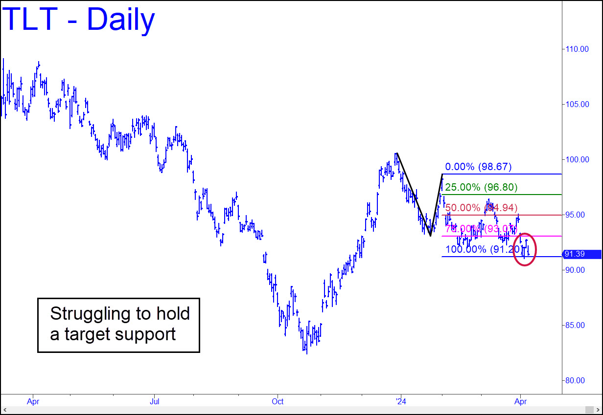 I warned here last week that if TLT couldn’t hold above the 91.20 Hidden Pivot support shown in the chart, we’d better look out below. It now appears that the support will fail, sending this T-Bond proxy into a vast void that extends all the way down to last October’s low near 82. If that happens, we’ll see a corresponding spike in rates that approaches or matches the 5% peak in the Ten-Year recorded last October. This is yet one more reason why the mass psychosis that has driven stocks into a relentless vertical climb is about to succumb to reality.