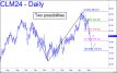 For a vehicle that appeared bound for $100, June Crude came in for quite a drubbing last week. The decisive down-move through p=79.94 on first contact implies the selling will likely hit 72.91 before bulls can turn things around. That would diminish the odds of an eventual move to par, especially if D is easily breached. Alternatively, the most bullish event I could foresee would be a sharp turn from p2=76.43. If that happens and the futures go on to exceed the April 26 peak at 84.46, that would all but clinch a follow-through to $100.