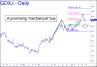 Although last week’s high at 47.25 fell well shy of the 49.02 Hidden Pivot target I’d identified, the chart shows more promise and potential than that of gold itself. GDXJ became a theoretical ‘mechanical’ buy when it touched the red line (p=44.52) Thursday on the way down, but I’d suggest waiting for the correction to hit x=42.20 before attempting to bottom-fish. FYI, the stop-loss for the red-line ‘mechanical’ buy that has already triggered would be at 42.97, but I am not recommending this trade because I expect this junior-miner proxy to trade lower.