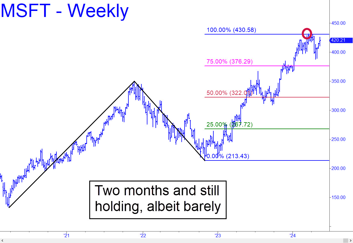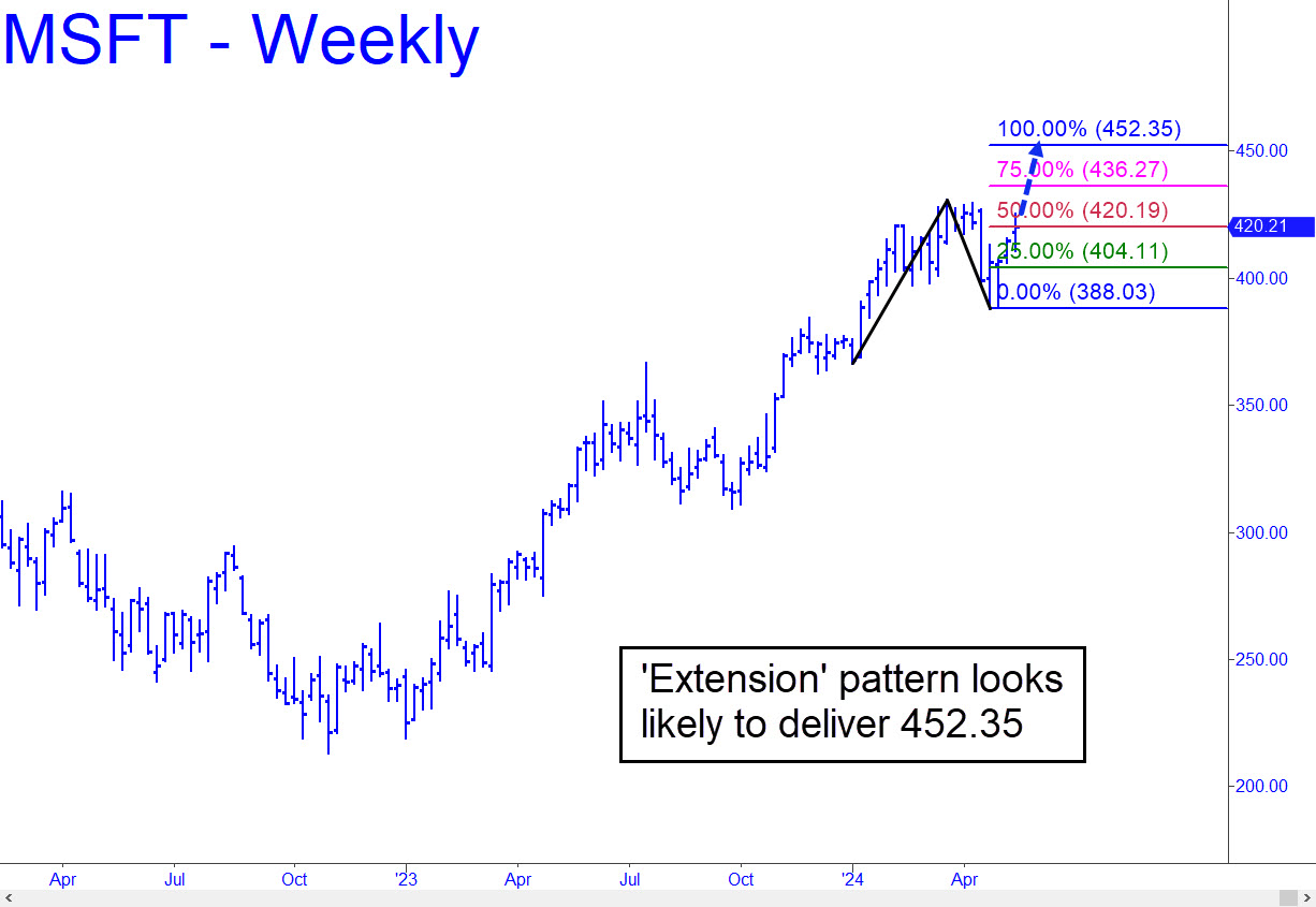 The 430.58 target first broached here in 2023 has shown remarkable pluck, but it seems fated to give way, if perhaps only marginally, because of last week’s poke above a challenging 421.63 Hidden Pivot resistance derived from a lesser pattern. There is no logical rationale for a strong burst higher right now, but we cannot rule it out because the stock market remains in the grip of mass psychosis. We’ll remain on high alert nonetheless, ready to exploit a head-fake that could provide exceptional leverage for a precisely timed purchase of put options. On the weekly chart, using A=366.50 from 1/5 yields a 452.35 target that looks well suited to that purpose.