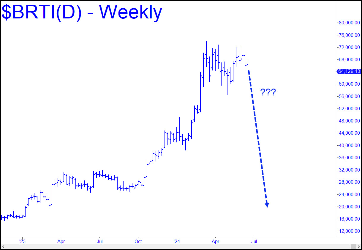 Hey, all you twenty-something, failure-adjusted, peach flavored hard seltzer-drinking, avocado toast-munching, downwardly mobile, squishy-gendered, Robin Hoodie, World-of-Warcraft miscreants: Listen up!! If you’re as desperate as I think you are to fatten your crypto wallets, you’ll need to pay up to find out exactly where bitcoin is headed next. Hint: The last three digits of my current price target are xx191. This will be a last-chance, bargain-basement retracement low before bitcoin blasts off for hyperspace. I’ve published the super-secret correction target in my chat room, and you need only click here for a free, two-week trial subscription that will give you instant access to the chat room and all the other nuggets of tradeable information that lie behind the Rick’s Picks paywall. No credit card is necessary, since that would only add to the unpaid balance, metastasizing at 21.99%, that has been devouring you limb-by-limb like a flesh-eating bacterium. _______ UPDATE (June 29): I’ve lowered my precise correction target (hint: it is below 56,000), a modification that has changed its last three digits to xxx709. UPDATE (July 5): Whether you subscribed or not, I hope my warning prepared you for the disaster that has unfolded in bitcoin. It has actually exceeded the original downside target, and so I’ve posted an ‘extension target’ in the chat room. It is my worst case at the moment and is below 51,000. Click here to sign up for a free two-week trial, no credit card required.