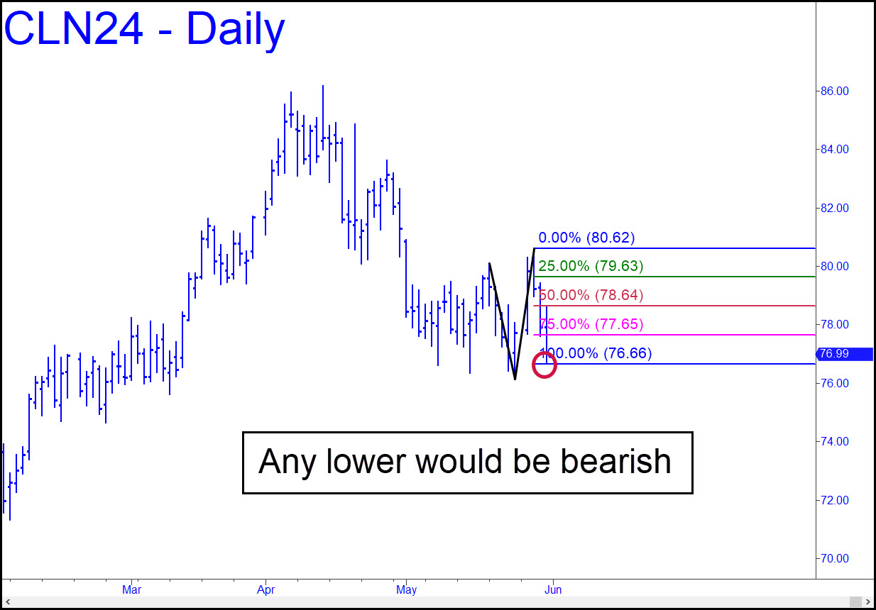 July Crude ended the week just above a low at the D=76.66 correction target shown in the chart. The pattern that produced the target is sufficiently delicate and precise to suggest that even a slight breach of D would be telegraphing further weakness. This would be a break for motorists and also help mitigate inflation, albeit probably not enough to quell some other powerful inflation inputs, including a dramatic rise in shipping costs. Slippage beneath D would likely send the July contract into the range 74-75 for yet more distribution.