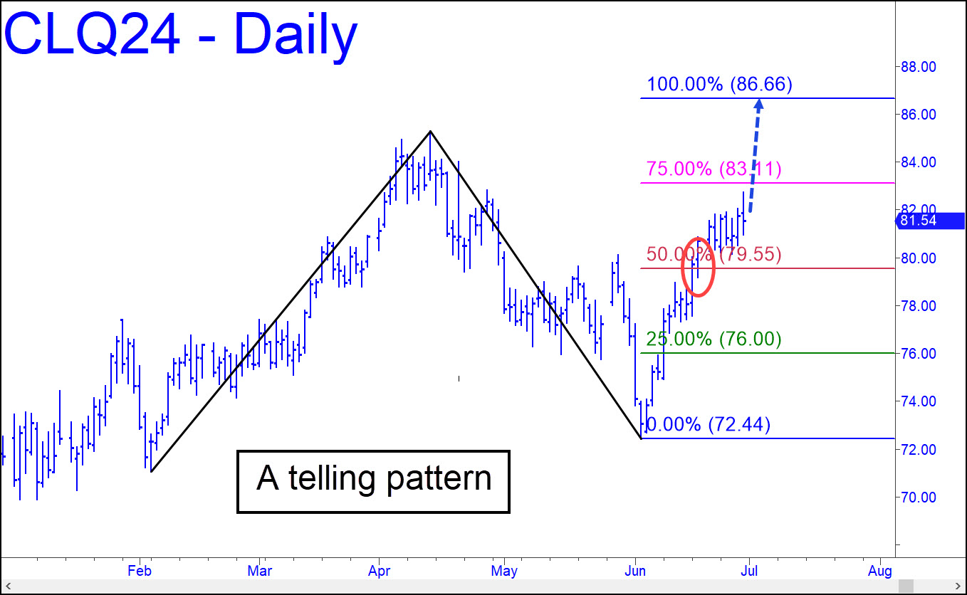 The easy move through p=79.55 in mid-June strongly suggests the August contract is bound for at least D=86.66. We can hope nonetheless that p2=83.11, the secondary Hidden Pivot, slows crude’s ascent; otherwise, pump prices, along with the price of nearly everything else, will receive a turboboost before summer is over. If there’s a silver lining, the pattern is compelling enough to imply there’s no great likelihood of a further push into the 90s.