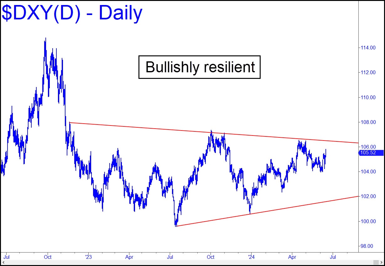 Bearishness on the U.S. dollar reached a shrill crescendo last week after the Saudis began accepting other currencies for oil. Some seem to think this will move the world away from the dollar as the global reserve standard, but I strongly disagree. The dollar’s indispensability for propagating a $2 quadrillion derivatives shell game is far more crucial to its supreme status in the world’s heavily financialized economy. Crude oil is certainly a large market, but it is puny in comparison to the nominal value of derivatives traded digitally around the world. The chart shows the dollar ensconced in the upper range of a wedge formation, An upside breakout without a cyclical correction down to the lower line would be very bullish, however illogical it might seem to dollar bears (aka ‘inflationists’). When the breakout occurs, it will leave the punditry, eggheads and bloviators who would consign the dollar to ignominy with some serious explaining to do. Suck it up, dudes!