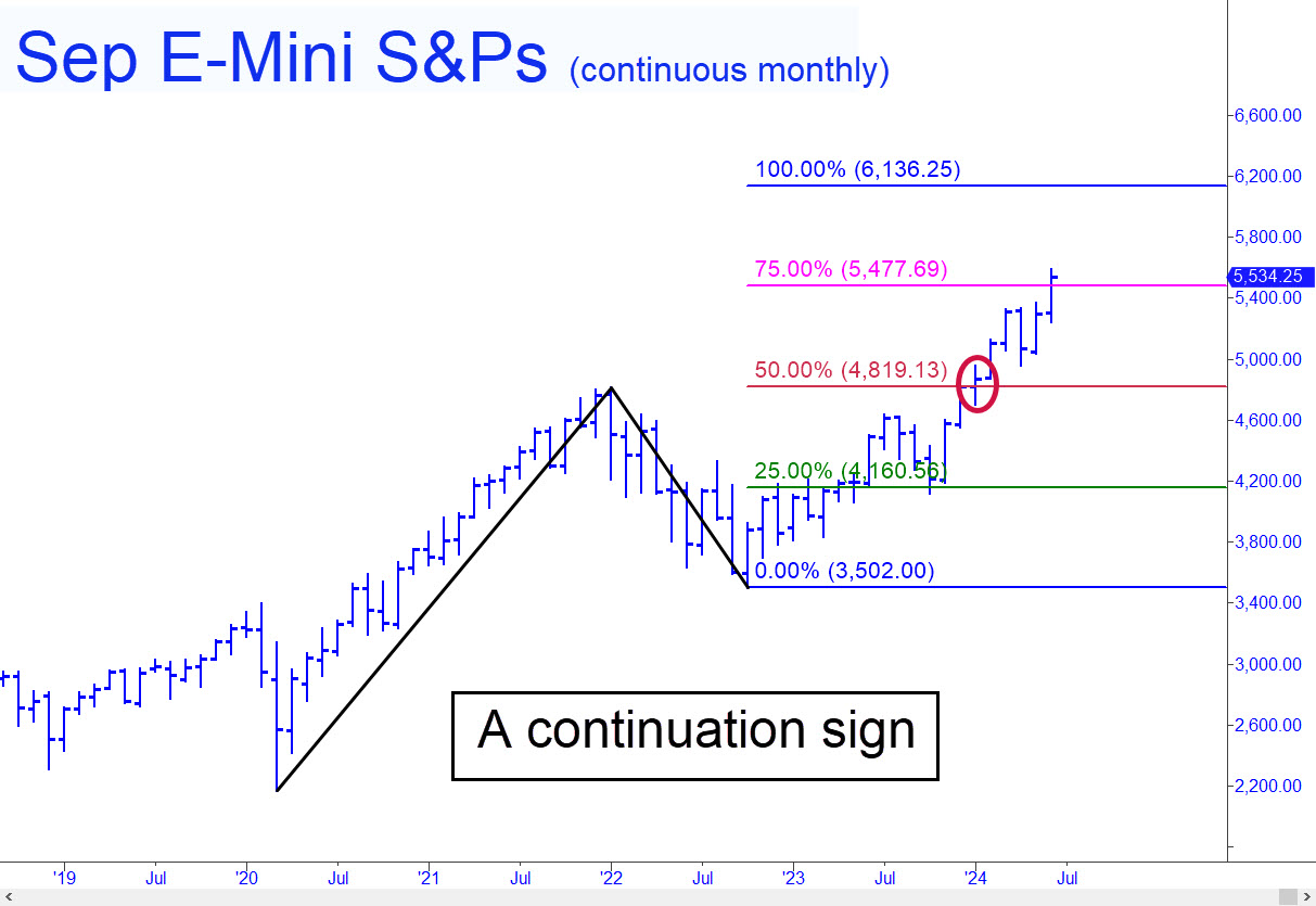 I’ve used a continuous monthly chart to project a 6136.25 target for the E-Mini futures. A corresponding target in the cash S&P Index (SPX) lies at 6118.34. These Hidden Pivots look likely to be reached, although not necessarily precisely, since the patterns from which they are derived will be all-too-obvious to every trader and technician in the game. They are nonetheless sufficiently compelling to not work in some fashion, presumably tradeably. In each instance, buyers had little trouble pushing past the respective HP midpoints, and that’s why I’m so confident the corresponding targets will be achieved. If the trend maintains its current slope, that should happen by no later than mid-October if not significantly earlier.