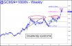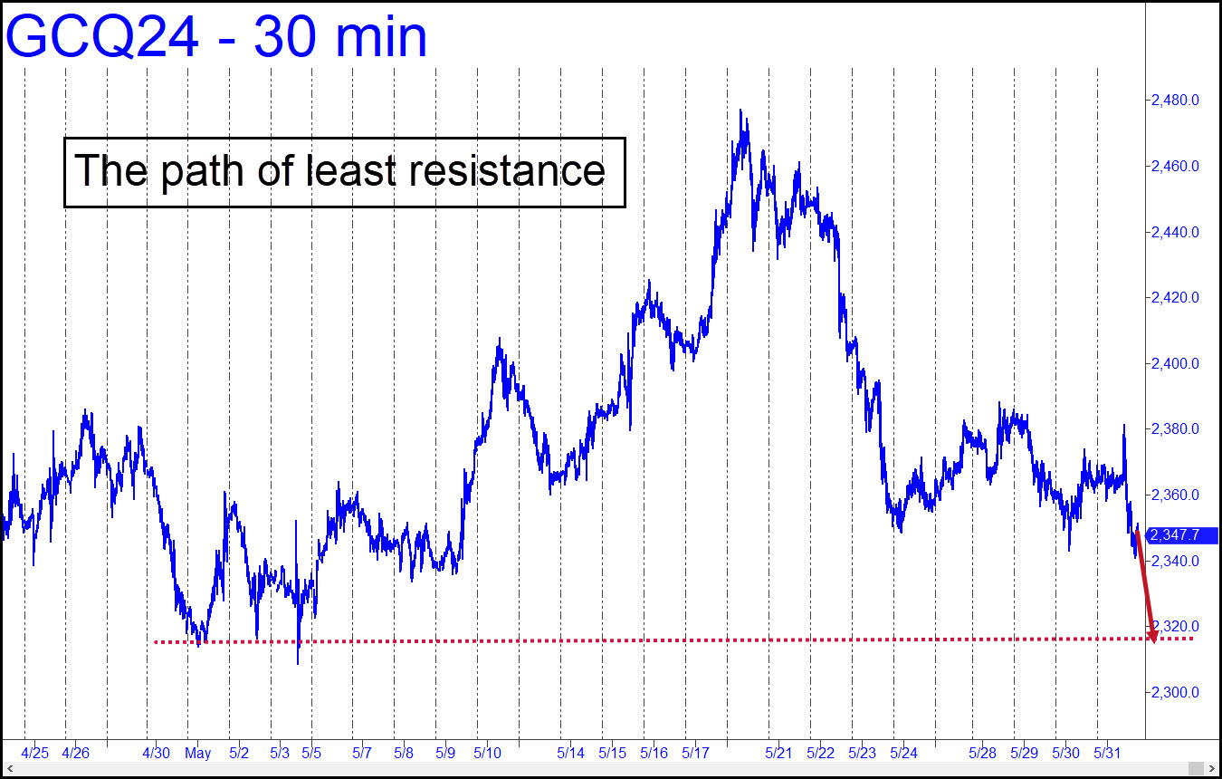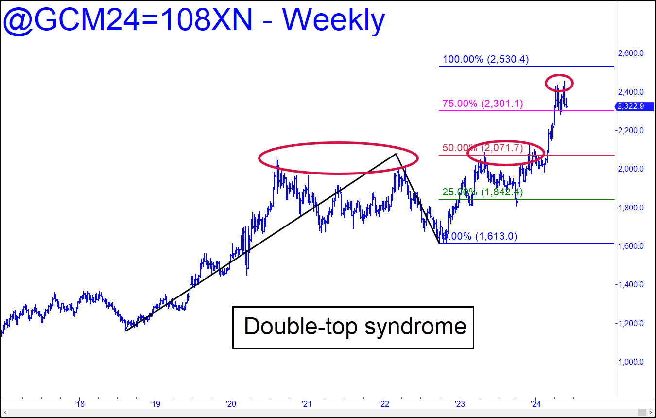 Gold has repeatedly resolved double tops in favor of bulls for many years, but always differently. The current pair of peaks is tightly spaced, giving the impression of weighty distribution. The 2530.40 rally target on this continuous weekly chart is viable nonetheless, and there is no reason to presume it won’t be reached. But that does not preclude a sharp pullback first to the red line (p2=2071.70). It makes a logical target if bulls are to be rebuked yet again for their steadfast belief in the quaint idea of gold’s historical primacy as money. For now, let’s draw our inferences from the lesser charts of August Gold, which currently provide an easy path down to 2300-2320. ______ UPDATE (June 7, 12:15 p.m.): Gold has in fact followed an all-too-‘easy path’ south, to a so-far low today of 2320.20. That is the upper threshold of the corrective range I’d forecast. However, I’d be surprised if the futures did not take out May 3’s 2308.70 low and then diddle 2300 just for good measure.