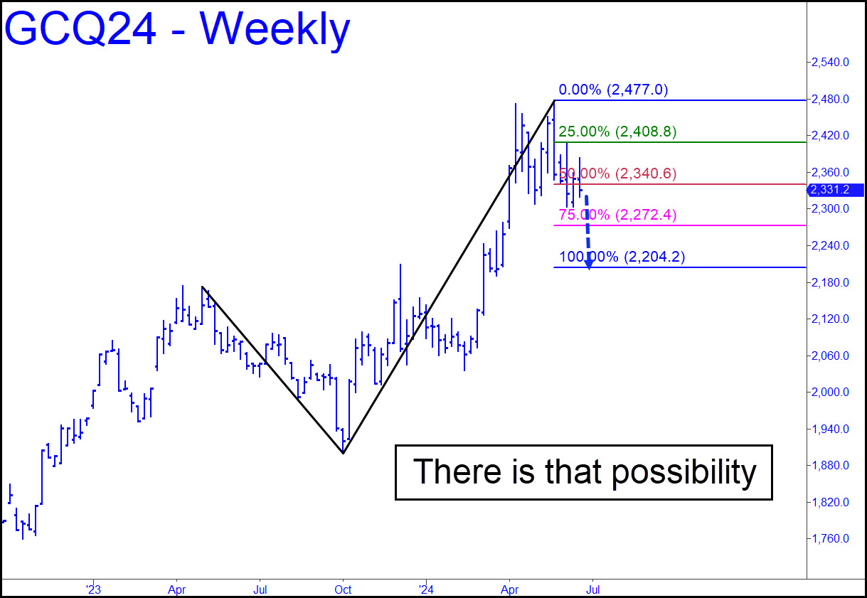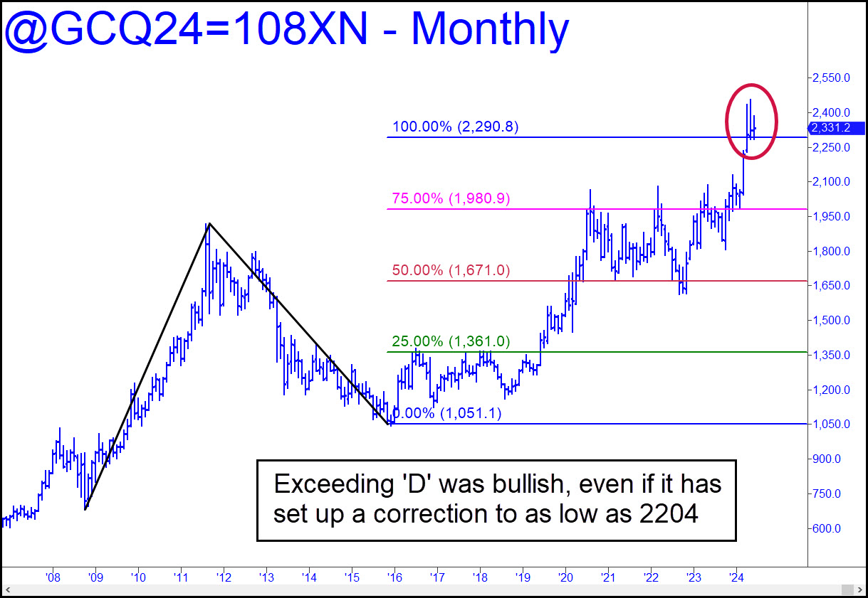 There was hubris in my assertion last week that the perfectly formed head-and-shoulders pattern that has been taking shape since April would mutate into a ‘surprise’ breakout to the upside. However, the chart shows what to expect if this forecast proves to be flat-out wrong. There is that possibility. The August futures would fall to 2204.20, completing the H&S pattern, before they could find traction. Moreover, the Auggies would become a juicy ‘mechanical’ short if they rally over the next week or two to the green line (x=2408.80). The pattern is quite gnarly because of the double top, but I’ve seen this set-up work perfectly in the metals before (do NOT tell your friends if you plan to bottom-fish there, as you should). Rest assured, however, that even a $200+ dive as described would not mar the otherwise bullish look of the long-term charts. If you’re still worried, here’s a continuous monthly chart that shows the ostensibly distributive head of the H&S to be occurring above the ‘D’ target of a completed pattern stretching back 15 years. That is inarguably bullish no matter how nasty this correction gets.