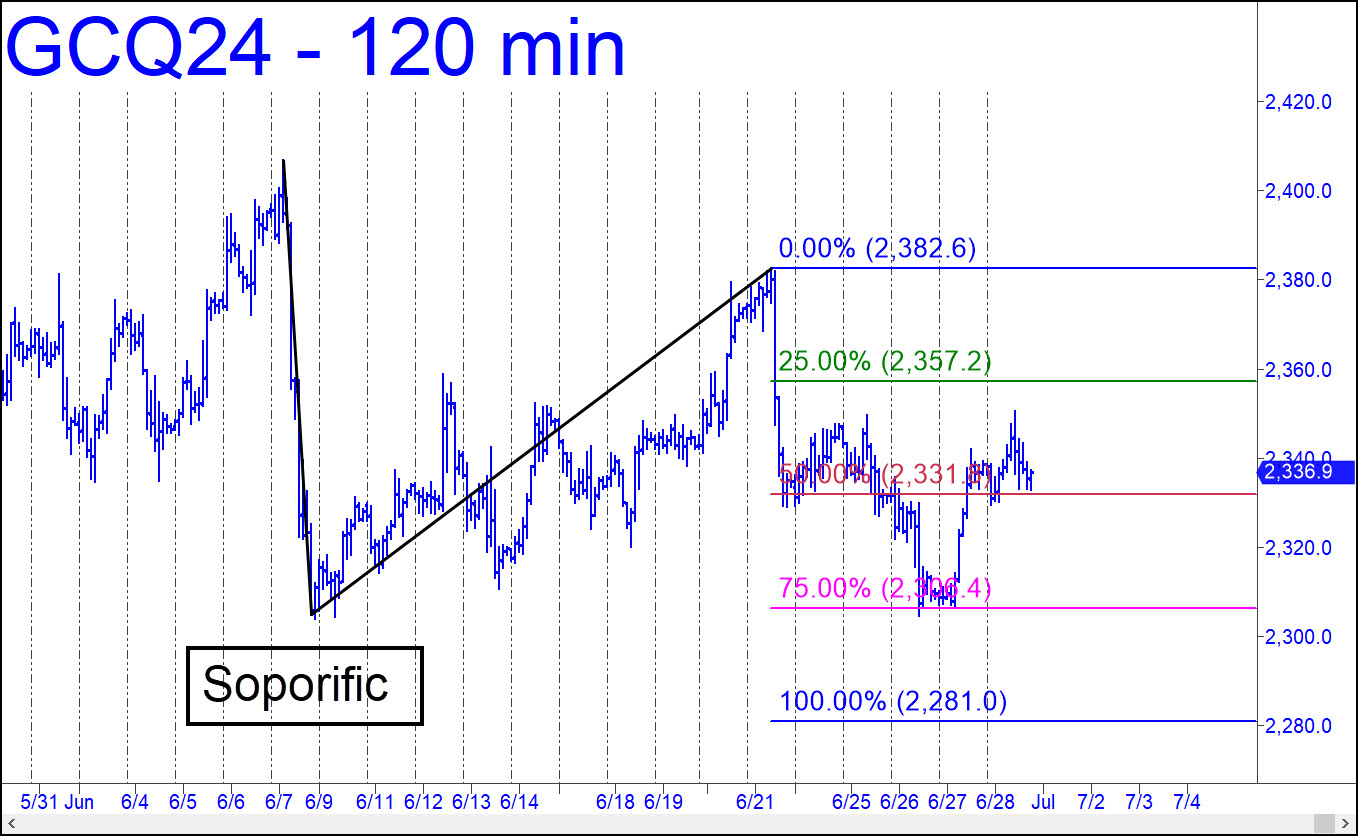 Last week’s thumb-wrestling match ended in a draw as bears failed to push the Auggies down to the 2281.00 target shown. The best they could muster was to diddle the secondary Hidden Pivot support at 2306.40 for nearly two days. The week ended with the futures mildly on the upswing, although a further push to the green line (x=2357.20) would trigger a ‘mechanical’ short. The opportunity looks second-rate, so I’ll recommend watching from the sidelines. A bigger picture shows a nearly three-month consolidation with potential to 2520 or higher. Somewhat lower prices remain likely for now, though.
