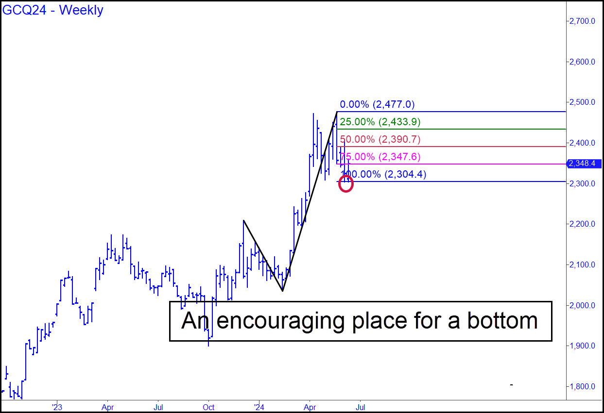 August gold finished the week with a second consecutive bottom at the 2304.40 ‘d’ target of the reverse pattern shown. Equally encouraging was a reversal at week’s end that left the futures sitting more than $40 above the lows. Someone in the chat room argued that gold’s $430 run-up earlier this year needs and deserves more consolidation, and that may be so. However, we should be alert to the possibility that this newly resurgent bull market will not be so accommodating of investors who want more time and better prices to do their bargain hunting. Bull markets in their dynamic stage are characterized by nasty swoons and quick recoveries. In any event, our short-term bias should be bullish as the new week begins, and we should look for minor, uptrending ABCD patterns that reach or exceed their ‘D’ targets. Correspondingly, we’ll also watch for corrective abcd patterns that surpass their midpoint Hidden Pivots. That is the most finely nuanced signal we have for flagging changes in larger trends.