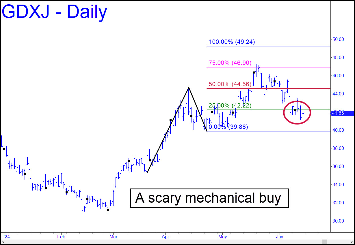 GDXJ has failed to get loft since triggering a mechanical buy more than a week ago. We are not supposed to feel comfortable when this type of trade is signaled, since it usually implies that the vehicle’s C-D leg has been reversed precipitously. That is true here, with a dip below the green line that came close enough to the ‘C’ low to make us anxious. My immediate outlook for bullion is bullish, however, and GDXJ should follow gold higher if the latter continues to rally as expected. It will not be out of theĀ woods, though, until such time as it exceeds the 45.51 ‘external’ high recorded on June 6.