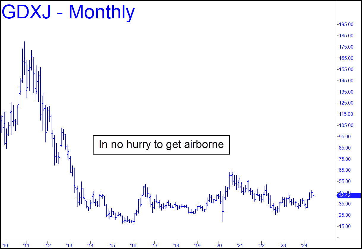 If you’re wondering when the miners are going to take off, this week’s chart offers a sodden dose of reality. Notice first that GDXJ is currently trading about where it was in 2013. Lows a few years later near $15 followed the cliff dive from 2011’s exhilarating precipice at 180. Who could have imagined that, 10 years later, mining shares would still be scuddling lazily along, tormenting investors more or less in proportion to the limit of their patience? Yes, this ETF could take flight at any time, like a bat from hell. And it will — just not on our time. If there is anything to console us in the meantime, it is the ease with which this vehicle’s gratuitous swings can be traded. Now, for instance, you can stay short down to 38.32, or do covered writes until then, and then reverse your position when the target is reached. That would be 2.60 below the so-far retracement low off May’s 47.25 peak. Don’t sweat the details.